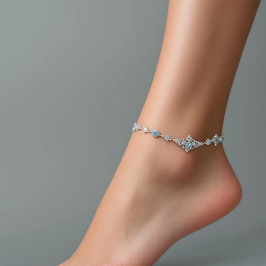 A beautifully handcrafted silver anklet featuring sparkling blue crystals designed in an elegant floral pattern. Lightweight, skin-friendly, and perfect for daily wear, parties, and gifting.