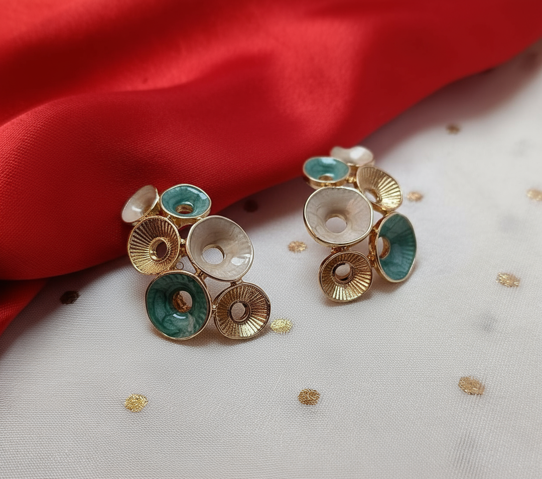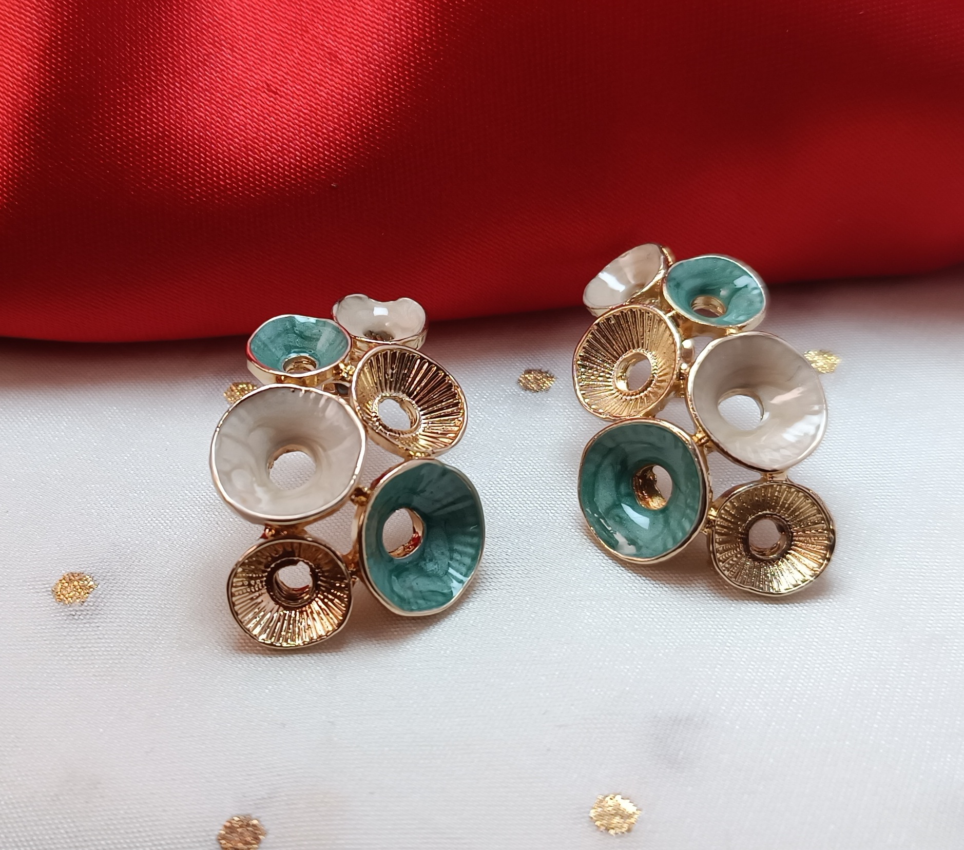 Type: Stud Earrings Style: Korean / Contemporary / Floral Design: Multi-circle flower-inspired pattern Material: Alloy with premium enamel coating Color: Gold base with Green & Ivory enamel Finish: Glossy with textured detailing Closure Type: Push-back (stud) Weight: Lightweight & comfortable for all-day wear Occasion: Party, Festive, Casual, Office, Gifting Package Includes: 1 Pair of Earrings