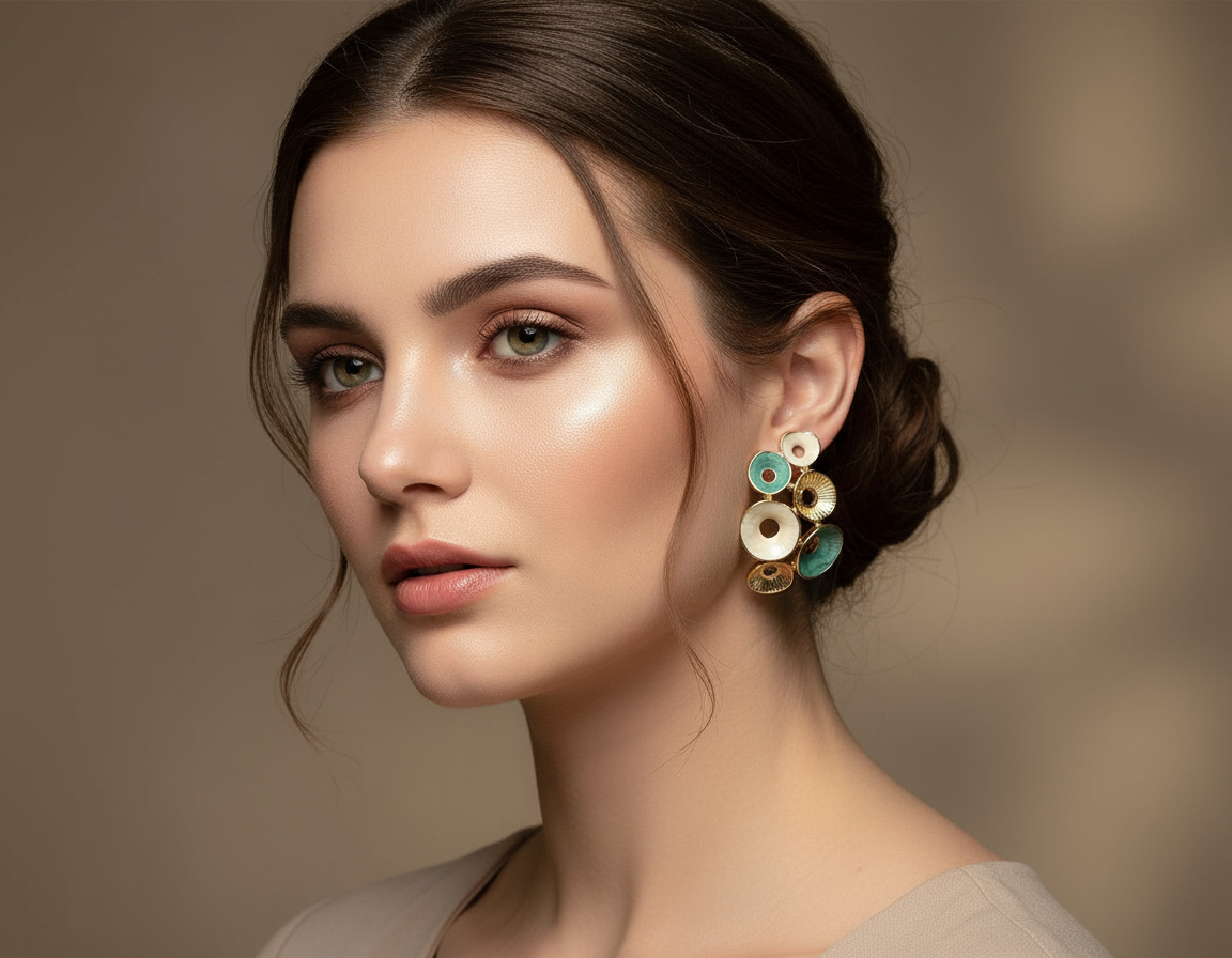 Add a touch of artistic elegance to your look with the Aurora Bloom Korean Designer Stud Earrings. Featuring a unique floral-inspired circular design with glossy enamel accents in soothing green, ivory, and gold tones, these earrings are perfect for modern women who love statement yet elegant jewelry. Lightweight and eye-catching, they effortlessly enhance both ethnic and western outfits.