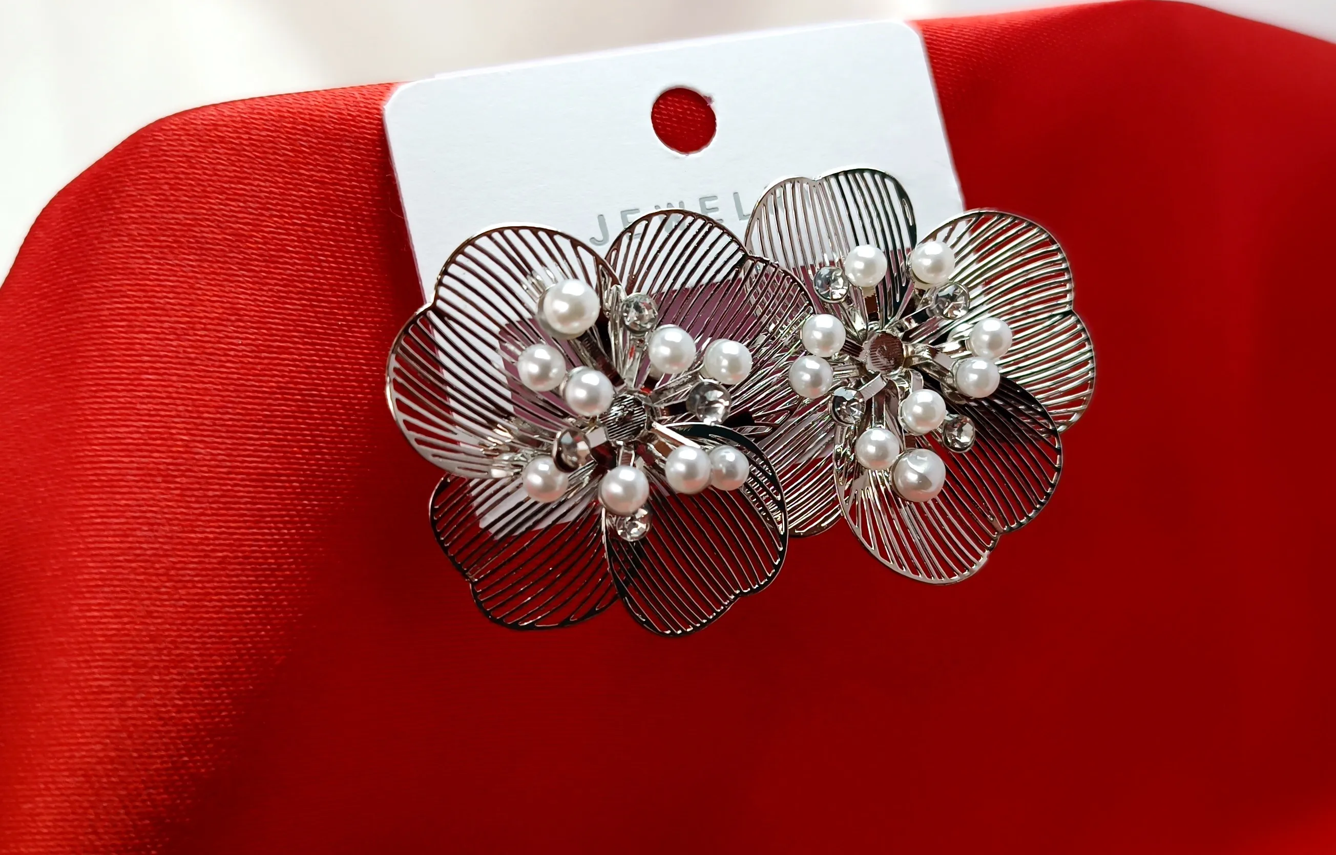 The center is intricately adorned with shimmering faux pearls and a hint of crystalline sparkle, making them the perfect bridge between contemporary chic and traditional elegance. Whether you're dressing up for a festive celebration, a wedding, or looking to elevate your office attire, these medium-sized studs offer a lightweight feel without compromising on impact.