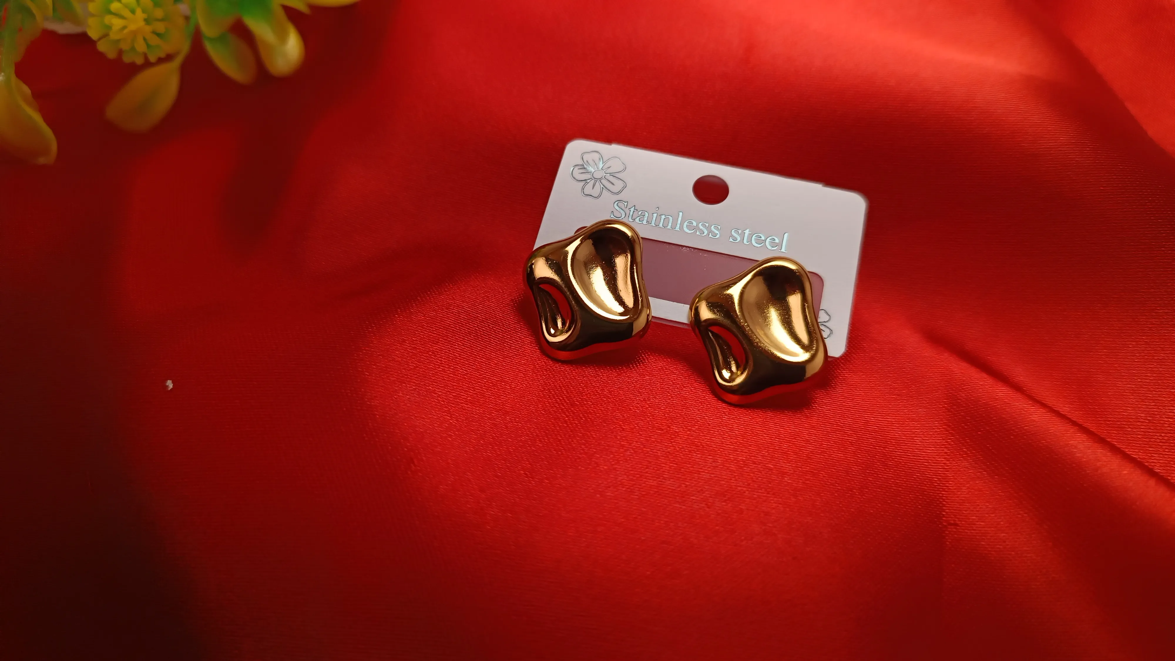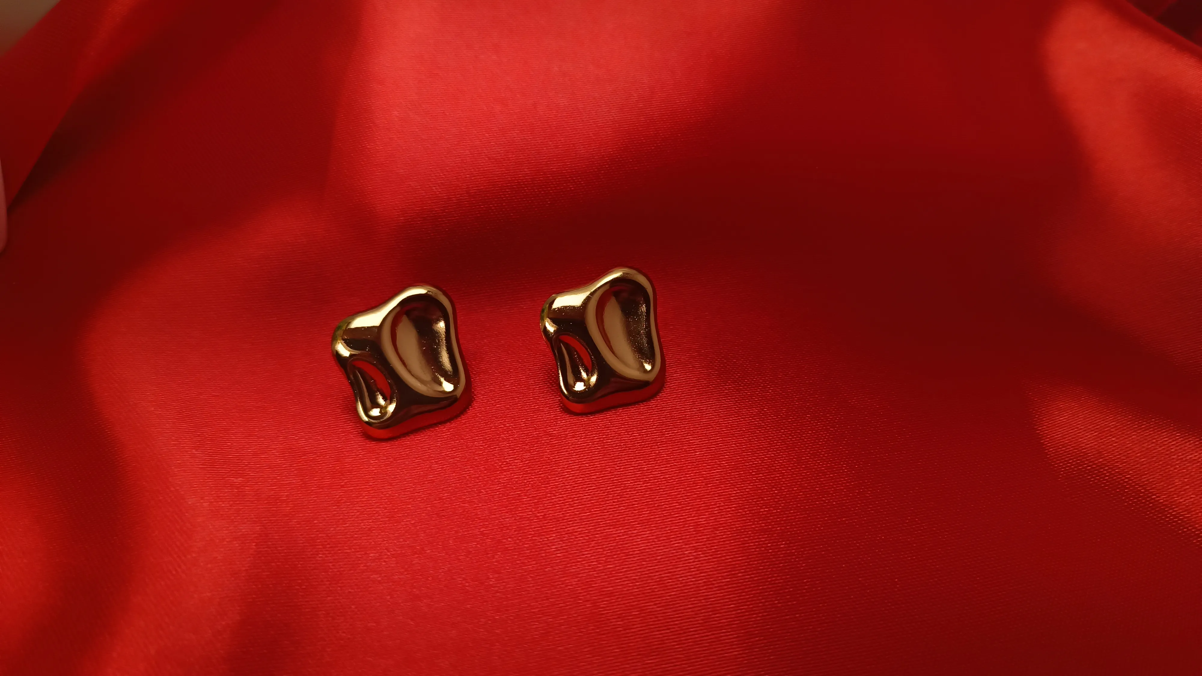 This pair is absolutely gorgeous. The design is fluid and organic, with a concave "scooped" center that reflects light in a very unique, focused way. It has a high-end designer feel, similar to modern "molten" metal art. Organic Concave Design: A unique "scooped" silhouette for a dimensional, high-fashion glow. Lustrous Gold Plating: Advanced PVD coating for a deep, durable gold finish that won't fade. Grade Steel: 100% skin-safe, nickel-free, and lead-free. Waterproof Resilience: Designed to withstand daily exposure to water and perfumes while maintaining its shine.