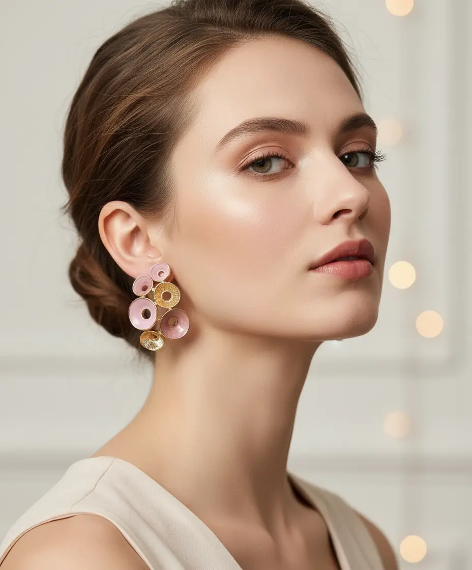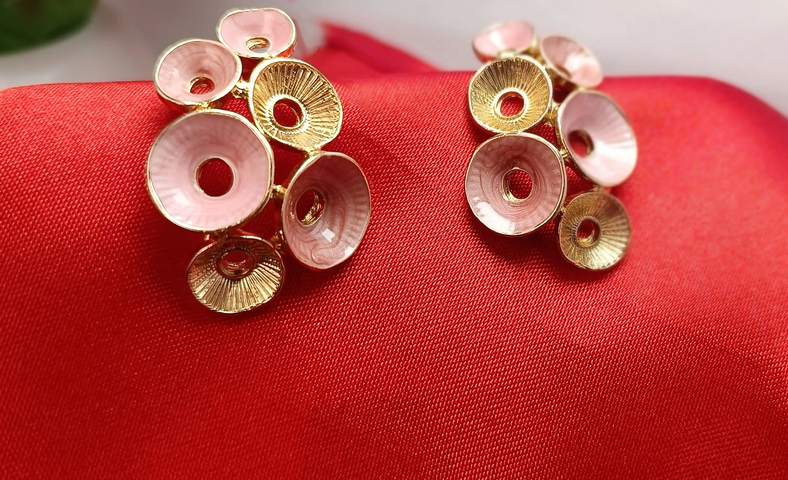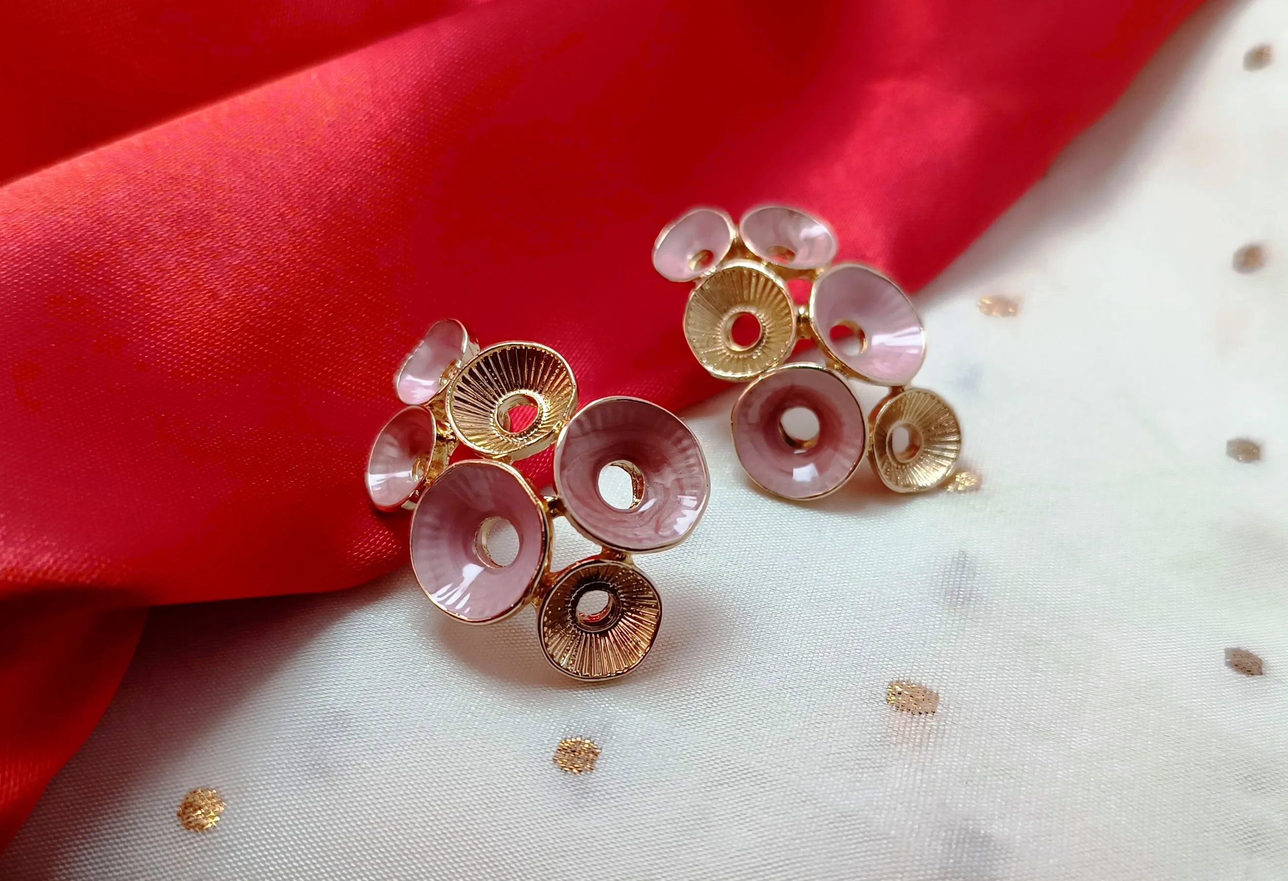 Add a soft and feminine touch to your look with these rose blush stud earrings. Designed with a beautiful mix of glossy pink enamel discs and textured gold elements, these earrings create a modern floral-inspired pattern. The anti-tarnish gold finish keeps them shining for longer, making them perfect for both everyday wear and special occasions.