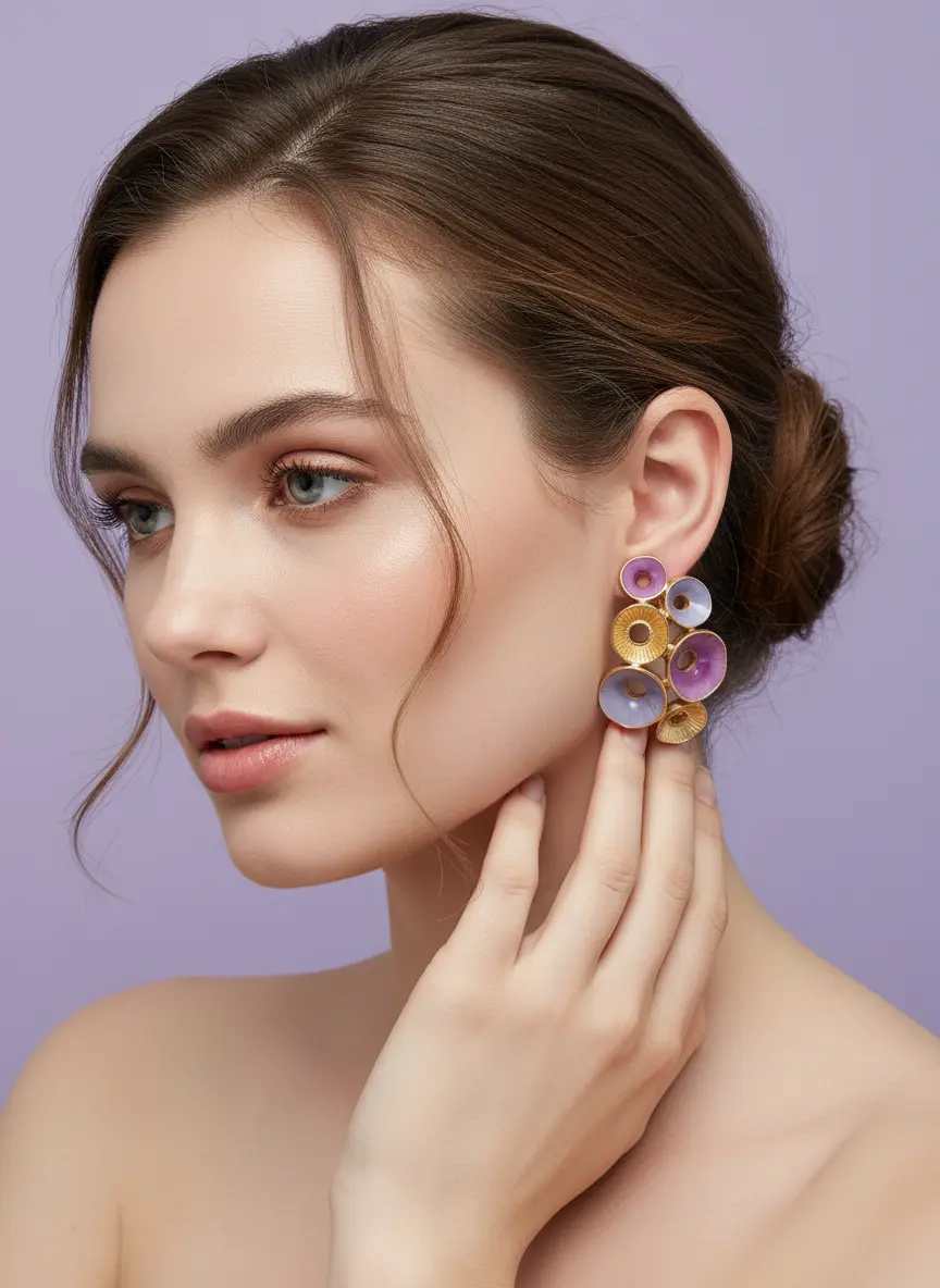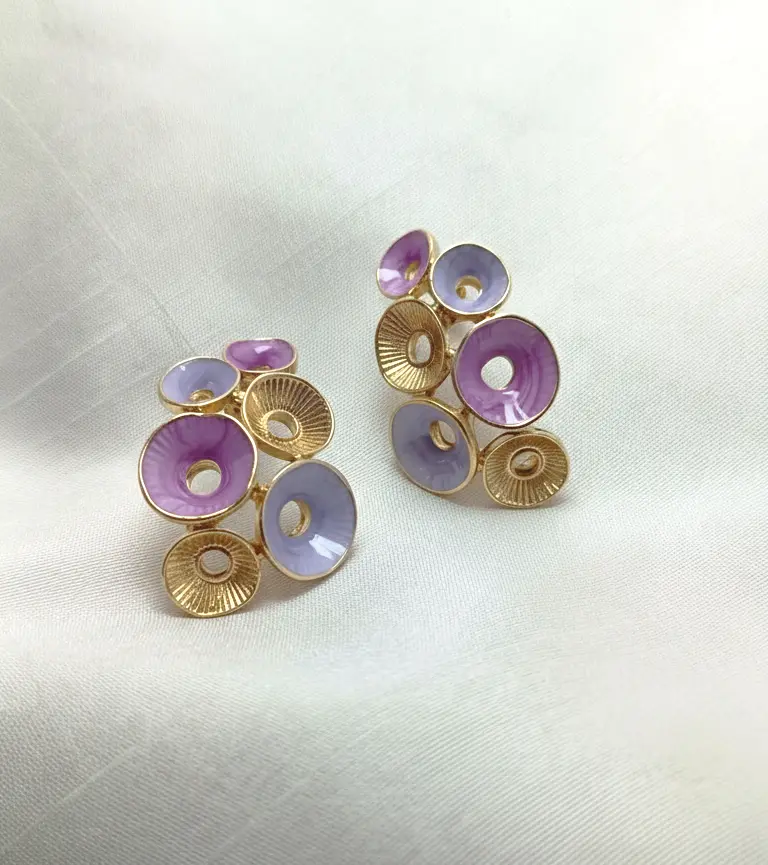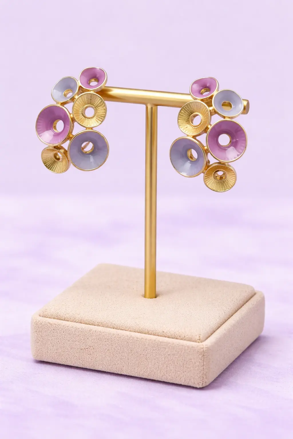 Bring a soft and elegant charm to your look with these pastel bloom stud earrings. Designed with a beautiful mix of pink and lavender enamel discs, paired with textured gold accents, these earrings create a unique floral-inspired pattern. The anti-tarnish gold finish ensures long-lasting shine, making them perfect for everyday wear as well as special occasions.