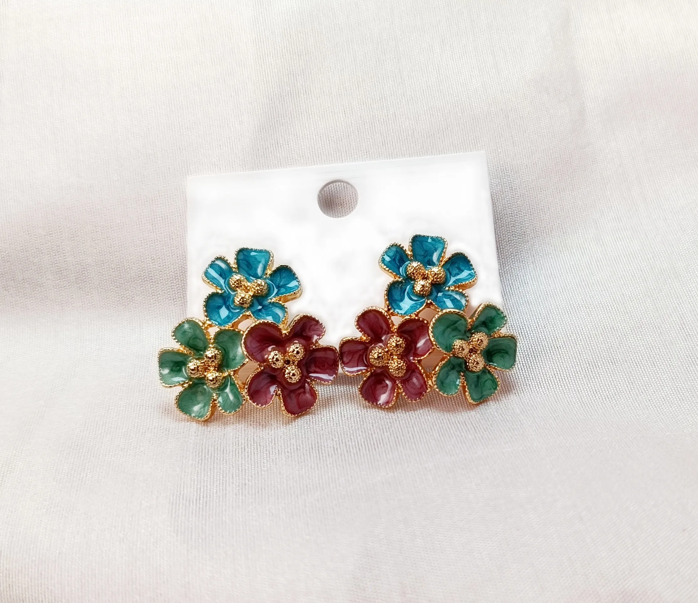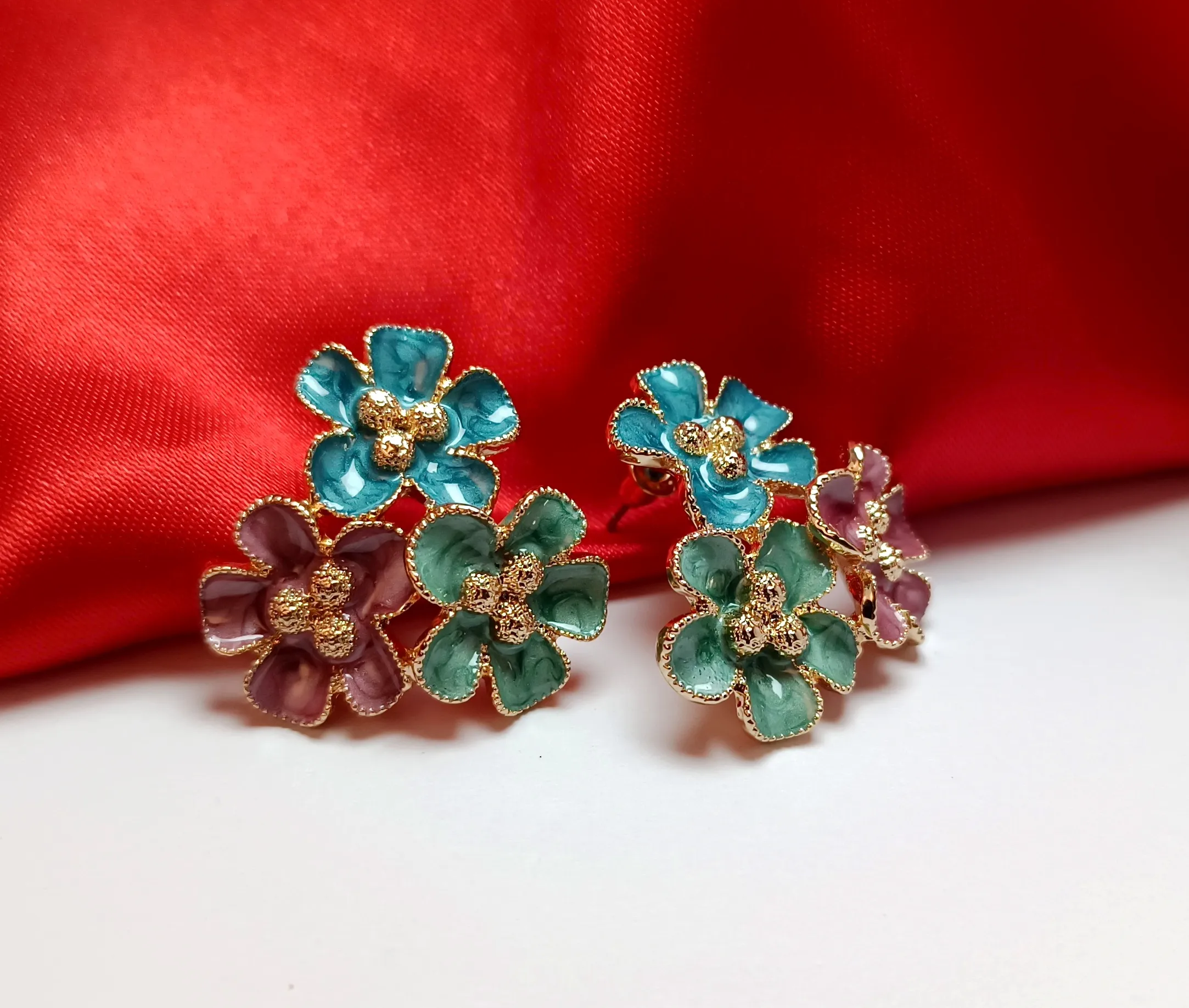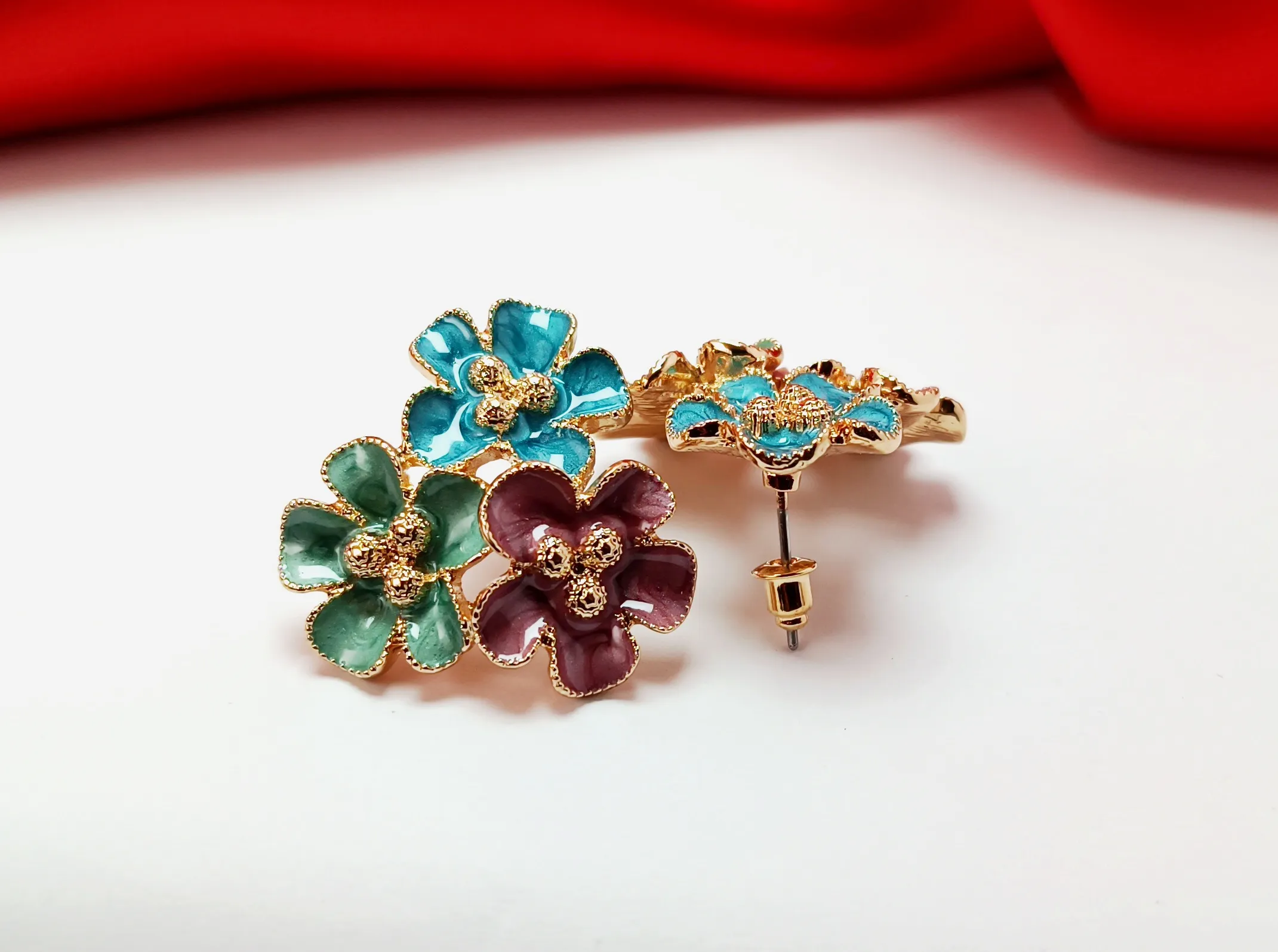 Inspired by a spring meadow, these earrings feature a cluster of three uniquely colored flowers. Each bloom is rendered in a soft pastel palette with a delicate gold-textured border. The centers are adorned with a "granulated" gold bead cluster, creating a 3D effect that mimics real floral anatomy.