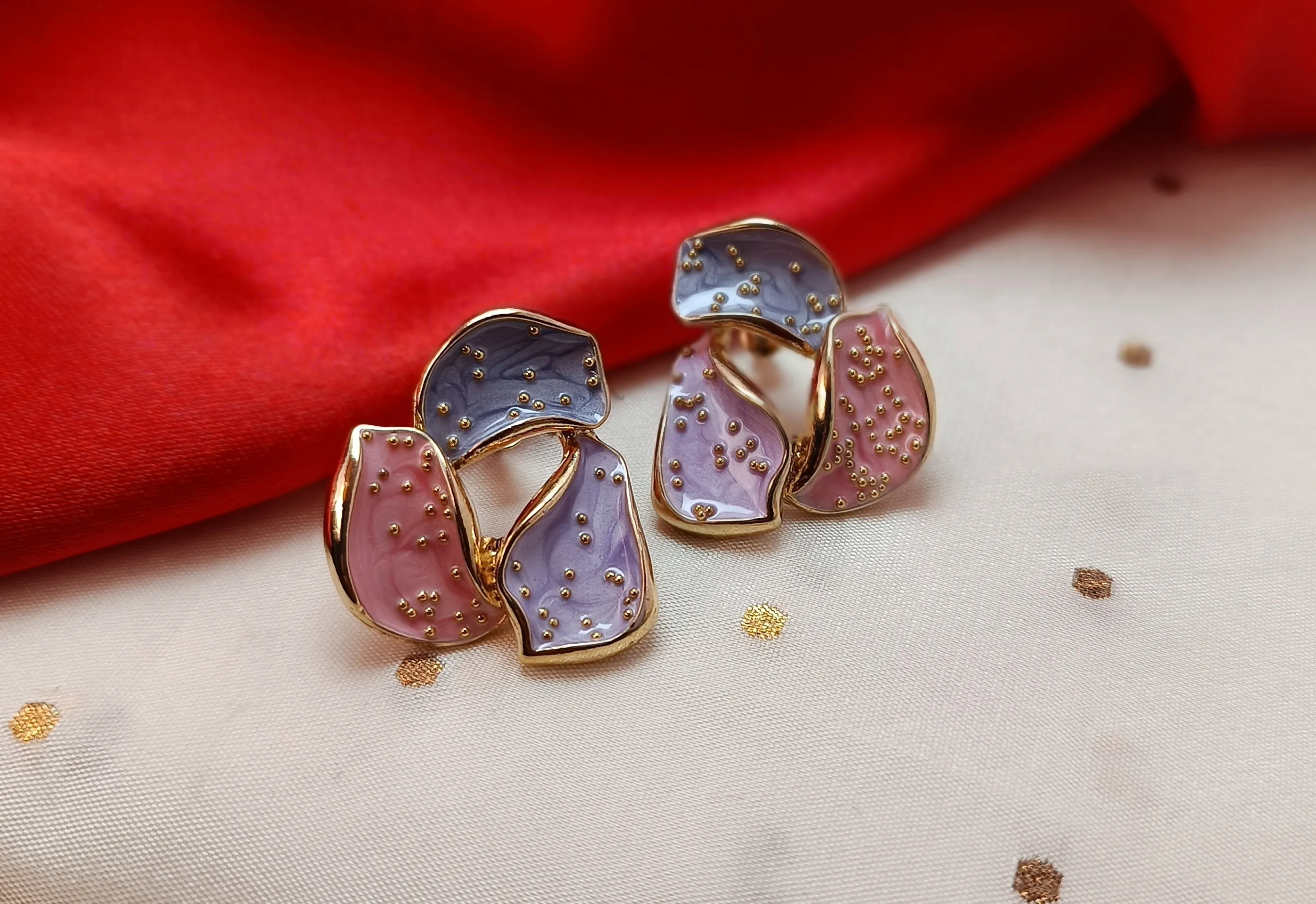 Elevate your everyday style with our Prism Petal Palette studs. These earrings are a masterful blend of modern abstract art and soft, feminine aesthetics. Featuring a unique three-petal "yin-yang" inspired silhouette, each section is hand-finished with smooth, glossy enamel in a variety of curated pastel trios—ranging from mint and lavender to soft rose and slate blue. Designed for the woman who loves a "pop of color" without the bulk, these medium-sized studs are textured with delicate gold-tone micro-beads for a touch of vintage shimmer. Lightweight and hypoallergenic, they are the perfect transition piece from a creative workday to a casual evening out.