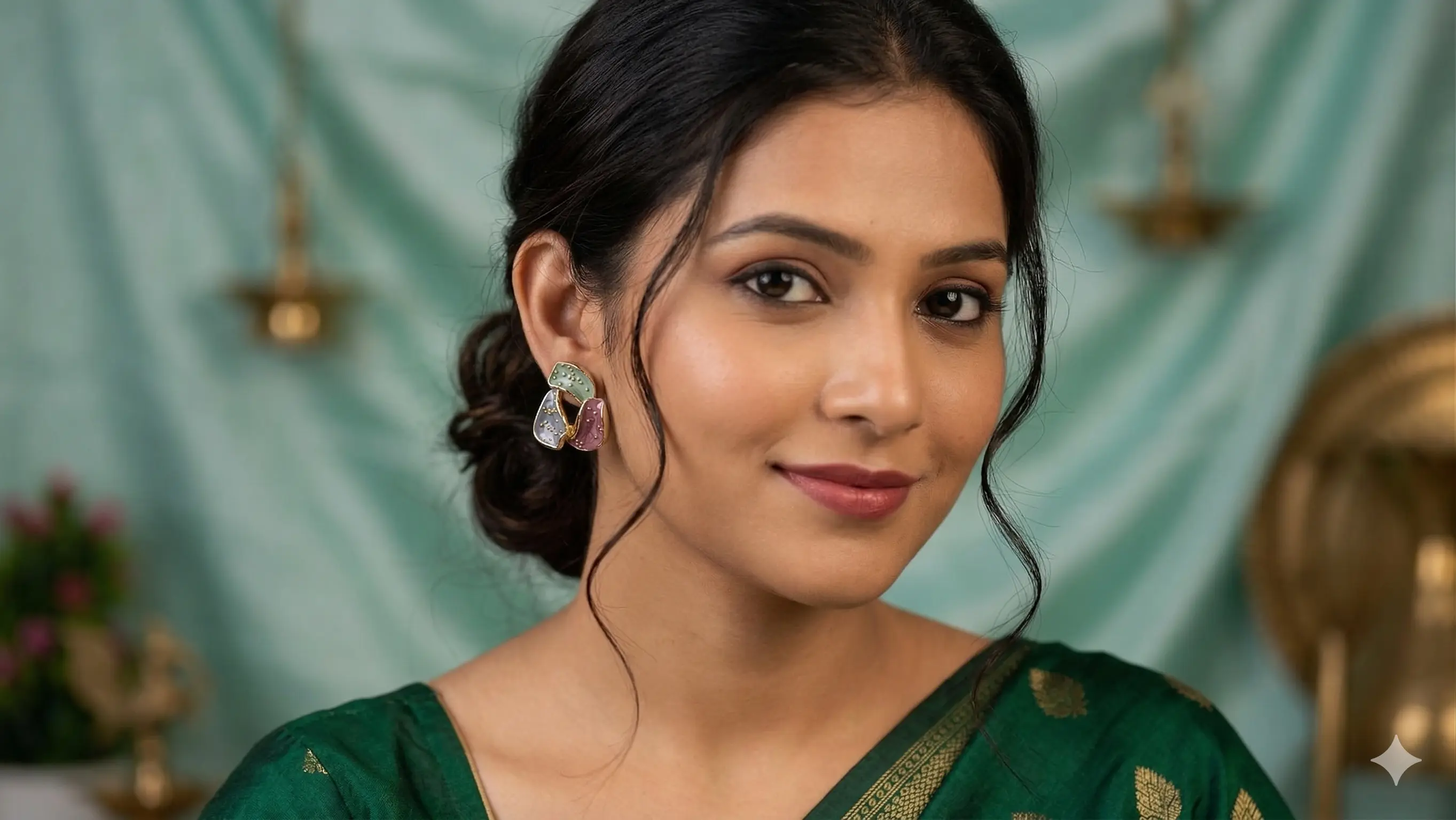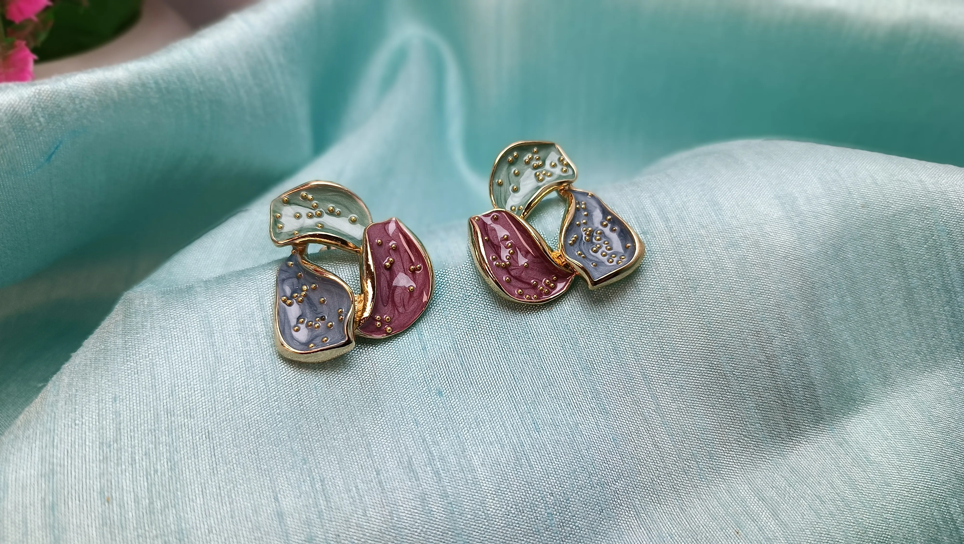 High-Gloss Hand-Painted Enamel, Pastel Mint/Lilac/Teal, Dusty Rose/Grey/Olive, and Sky Blue/Burgundy/Mint, Abstract Curvy Petal Clusters with Gold Micro-Beading, Surgical Steel Post with Secure Silicone/Butterfly Back, Feather-light (4g per pair), Comfortable Medium Fit