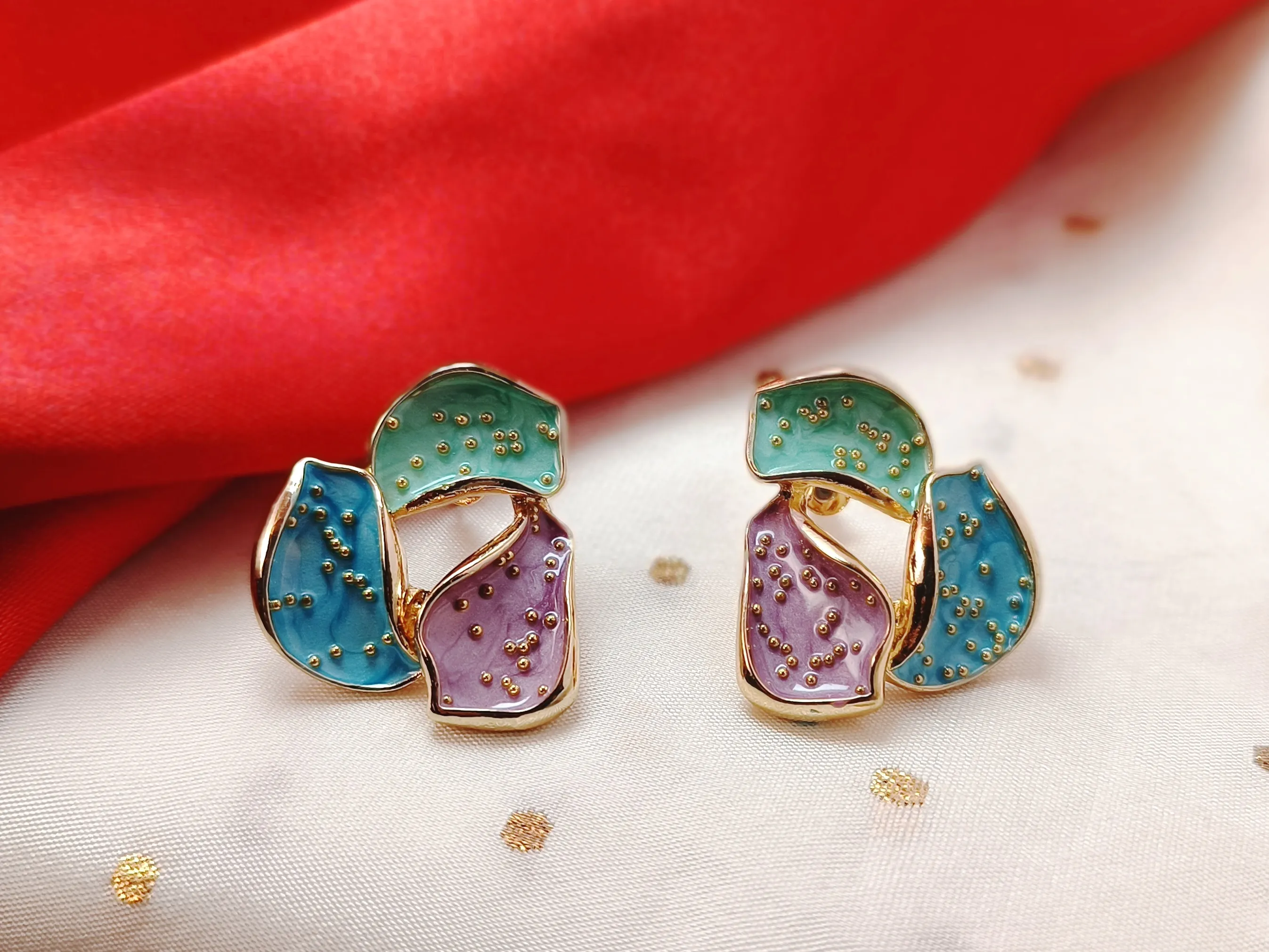 Prism Petal Palette Blue Green Abstract Enamel Trio Studs | Multi-Color Pastel Korean-Style Earrings