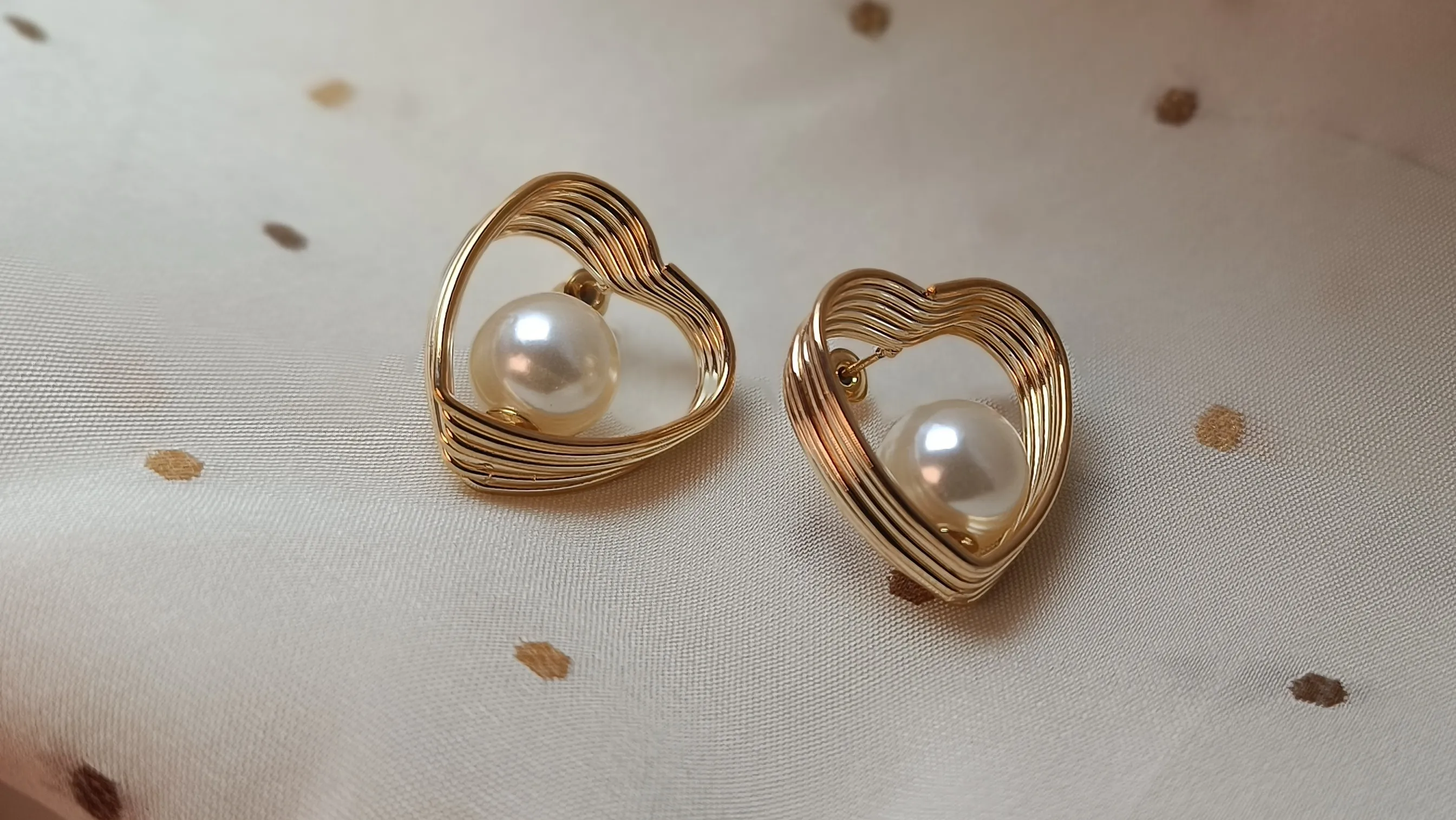 Design: Concentric multi-strand gold-tone wire frame in a heart shape with a centered floating pearl.