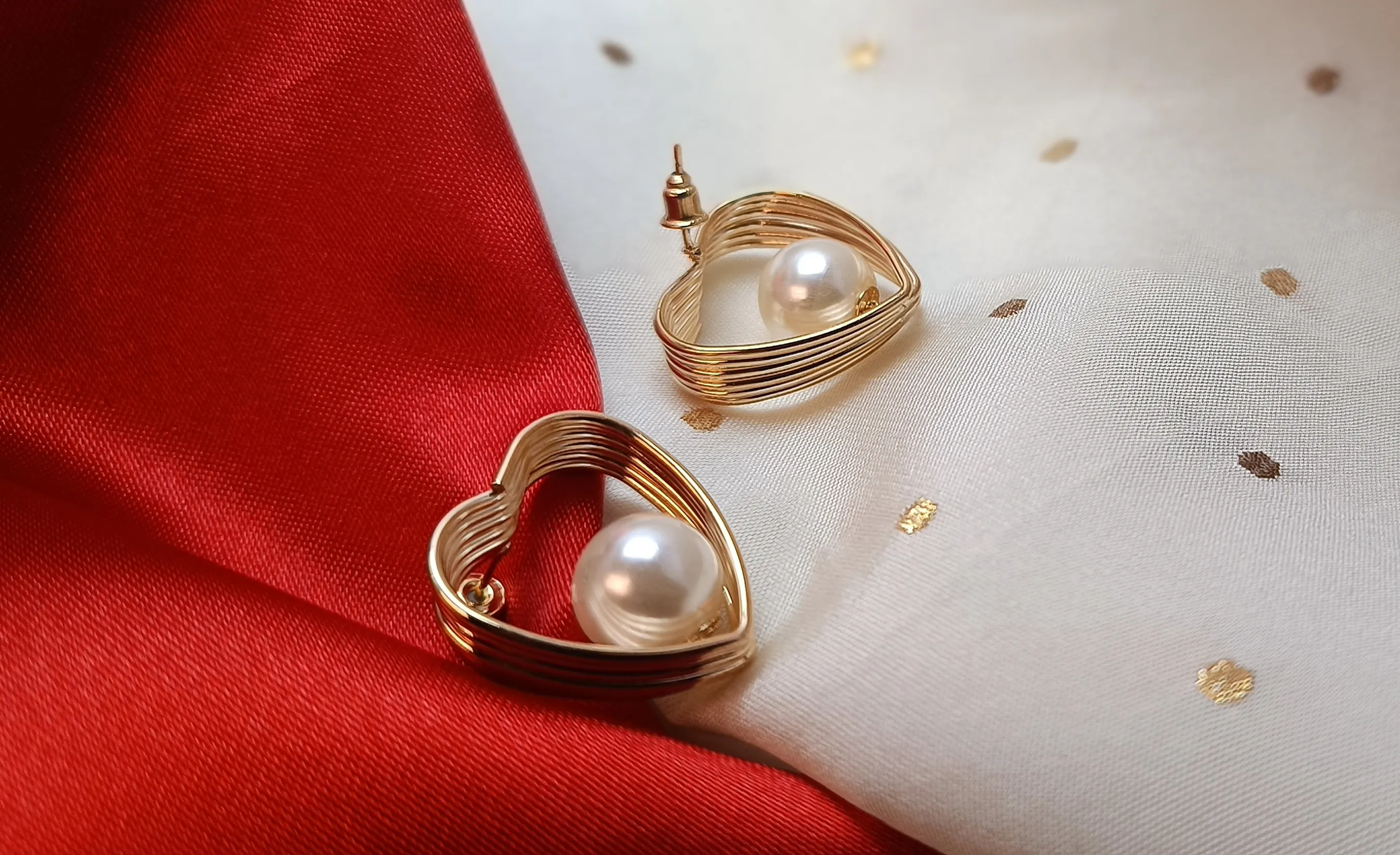 Gold Plated Spiral Wire Heart & Pearl Stud Earrings – Romantic Minimalist Jewelry