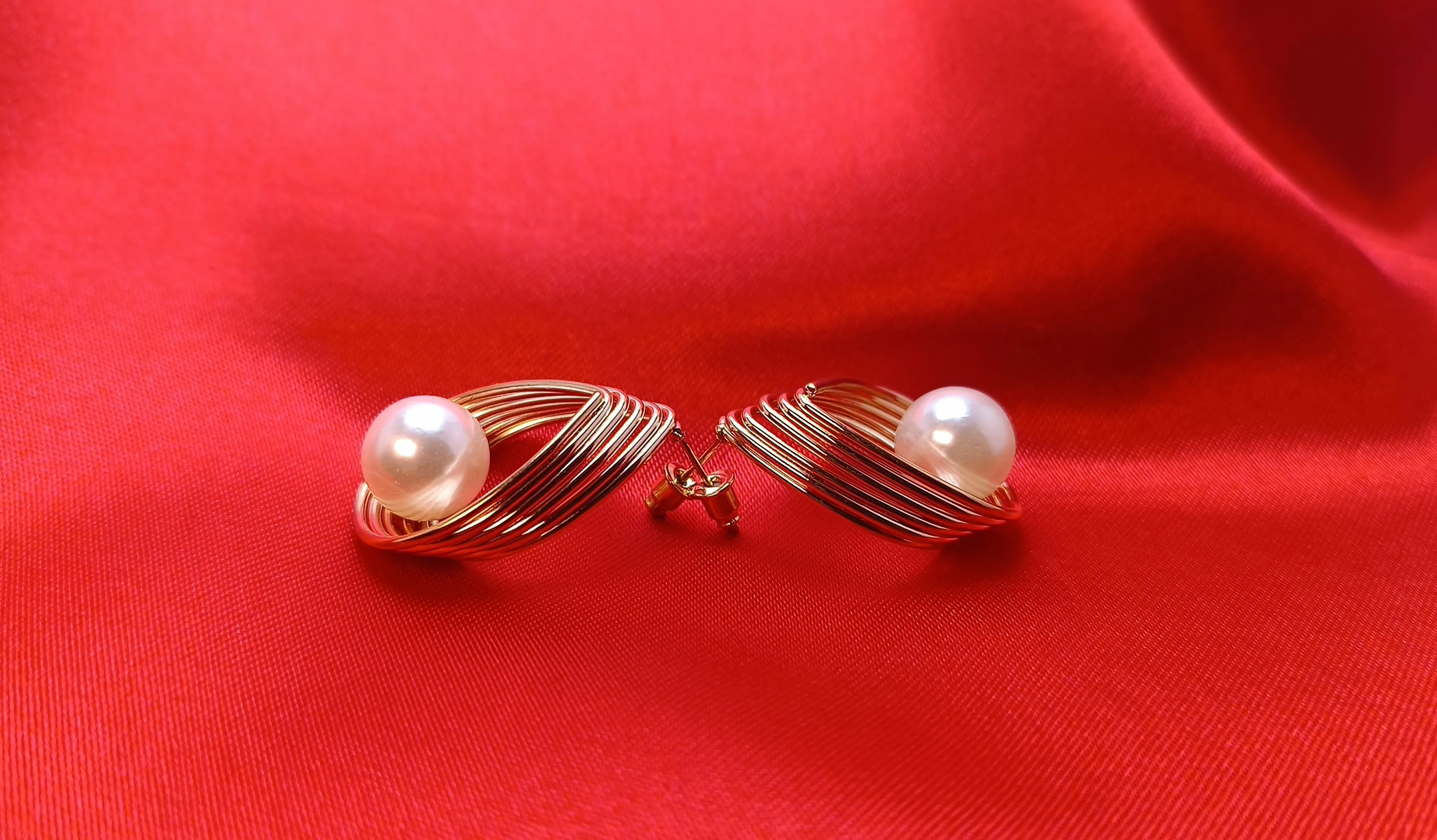 Gold Plated Spiral Teardrop & Pearl Earrings – Elegant Architectural Studs