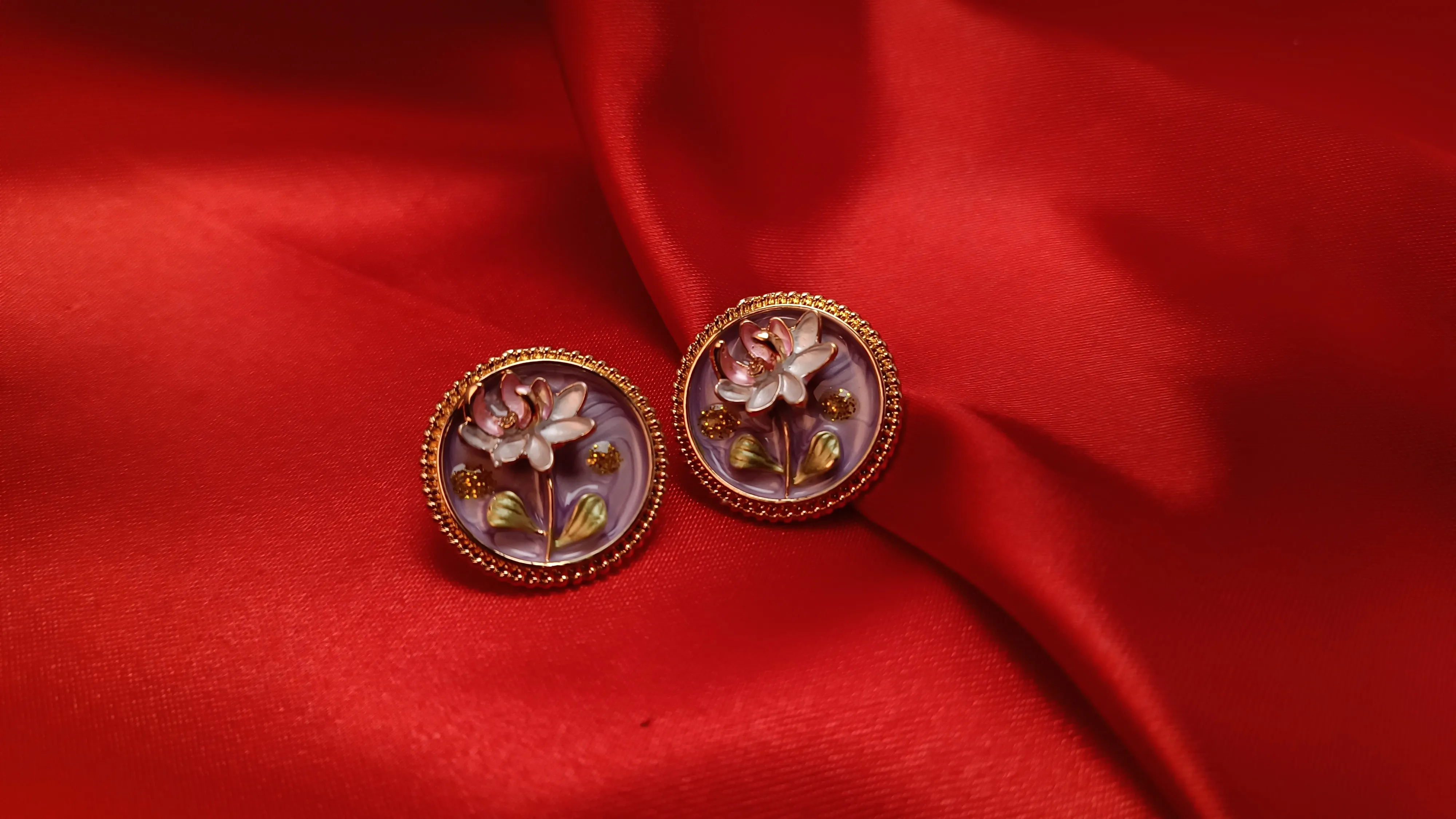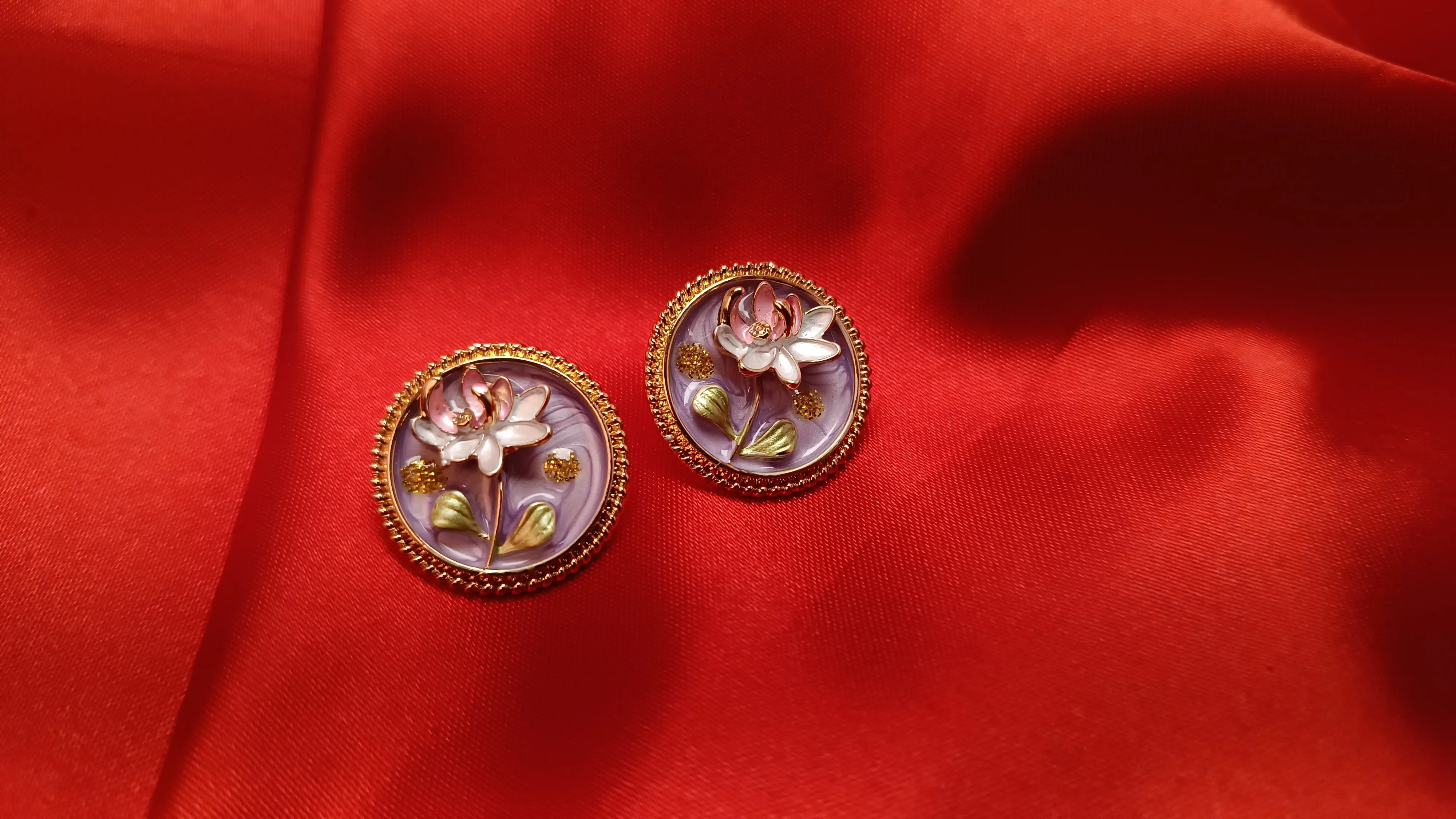 Immerse yourself in the lush elegance of our Emerald Garden Medallion Studs. A striking variation of our vintage-inspired collection, these circular earrings feature a rich, deep emerald Soft Pink enamel base that provides a dramatic backdrop for the hand-painted floral artistry. At the heart of each medallion is a delicate lotus blossom, rendered in soft pearlescent white and tipped with gentle rose pink. Intricate Purple stems and shimmering gold-leaf accents add layers of depth, all encased beneath a crystal-clear, high-gloss resin dome. Finished with a signature gold-toned beaded frame, these studs capture the essence of a hidden garden in a timeless, wearable piece of art.