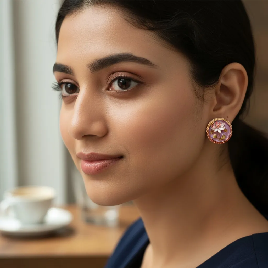 Hand-Painted Cold Enamel & Transparent Resin Overlay , Soft Rose, Pearl White, Purple, and Champagne Gold, Circular Medallion / Cameo Style with Beaded Frame, Balanced for All-Day Wear (Lightweight), Hypoallergenic Post with Butterfly Back
