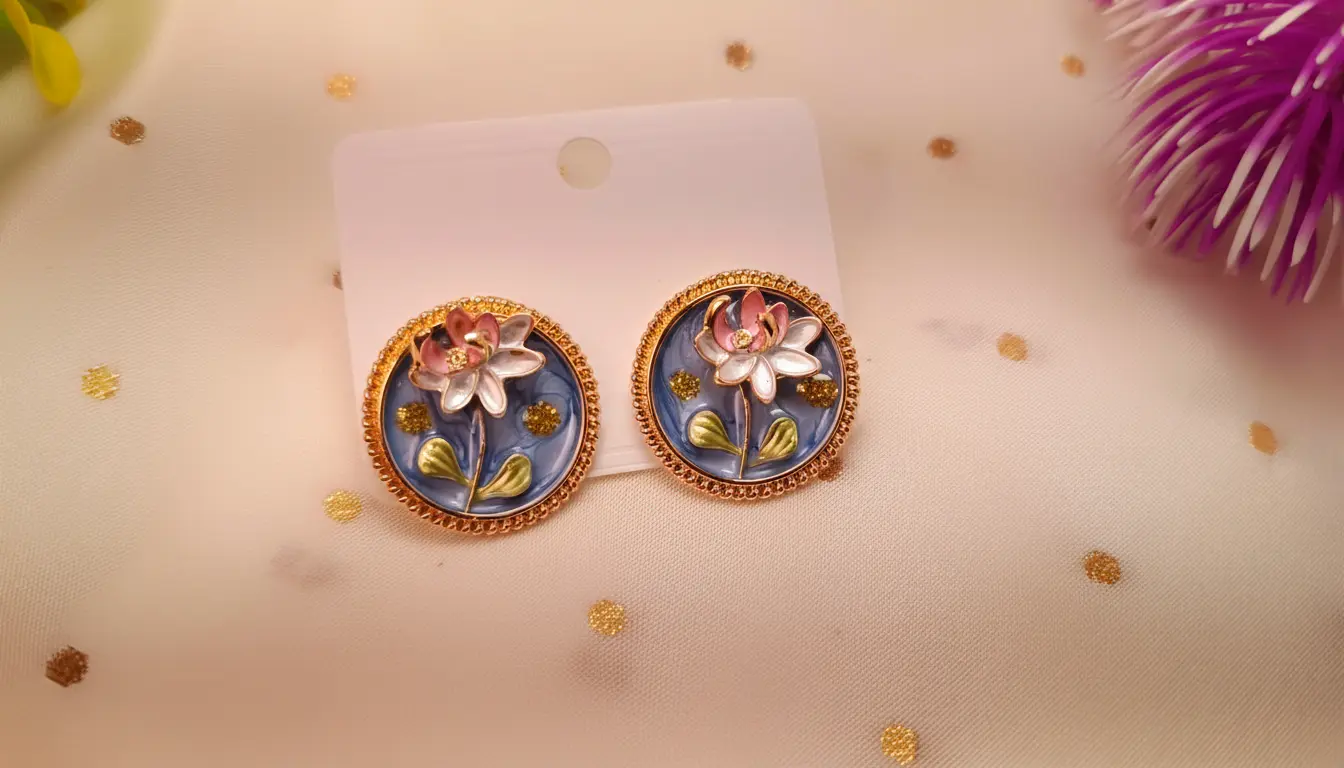 At the heart of each medallion is a delicate lotus blossom, rendered in soft pearlescent white and tipped with gentle rose pink. Intricate sage green stems and shimmering gold-leaf accents add layers of depth, all encased beneath a crystal-clear, high-gloss resin dome. Finished with a signature gold-toned beaded frame, these studs capture the essence of a hidden garden in a timeless, wearable piece of art.