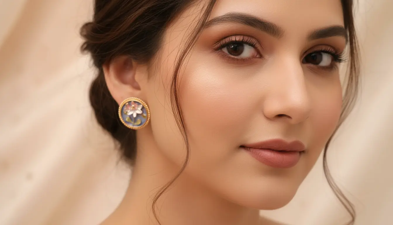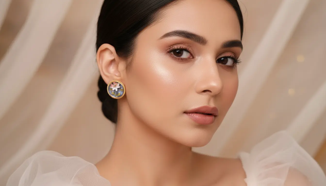 Hand-Painted Cold Enamel & Transparent Resin Overlay , Soft Rose, Pearl White, Blue, and Champagne Gold, Circular Medallion / Cameo Style with Beaded Frame, Balanced for All-Day Wear (Lightweight), Hypoallergenic Post with Butterfly Back