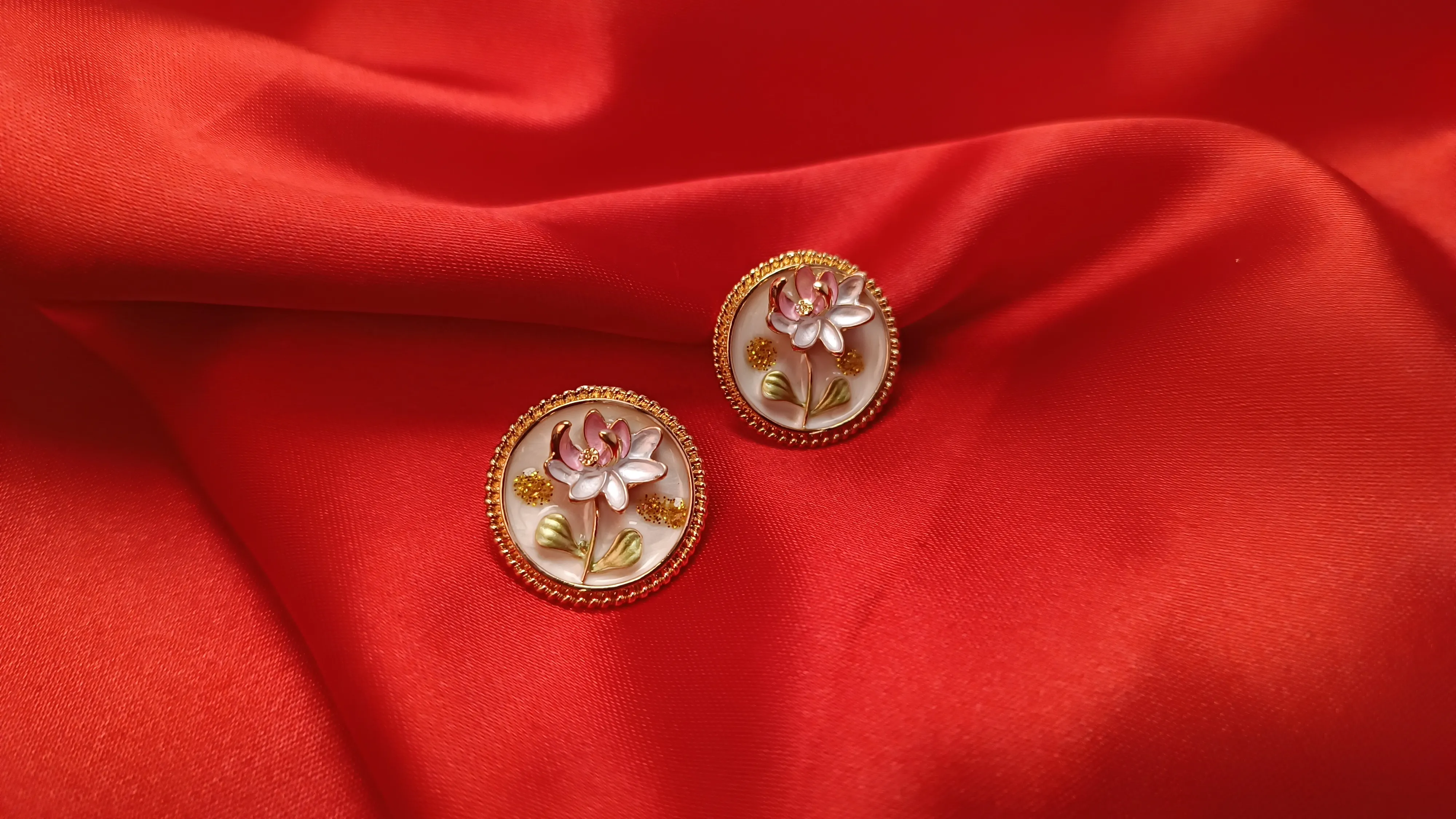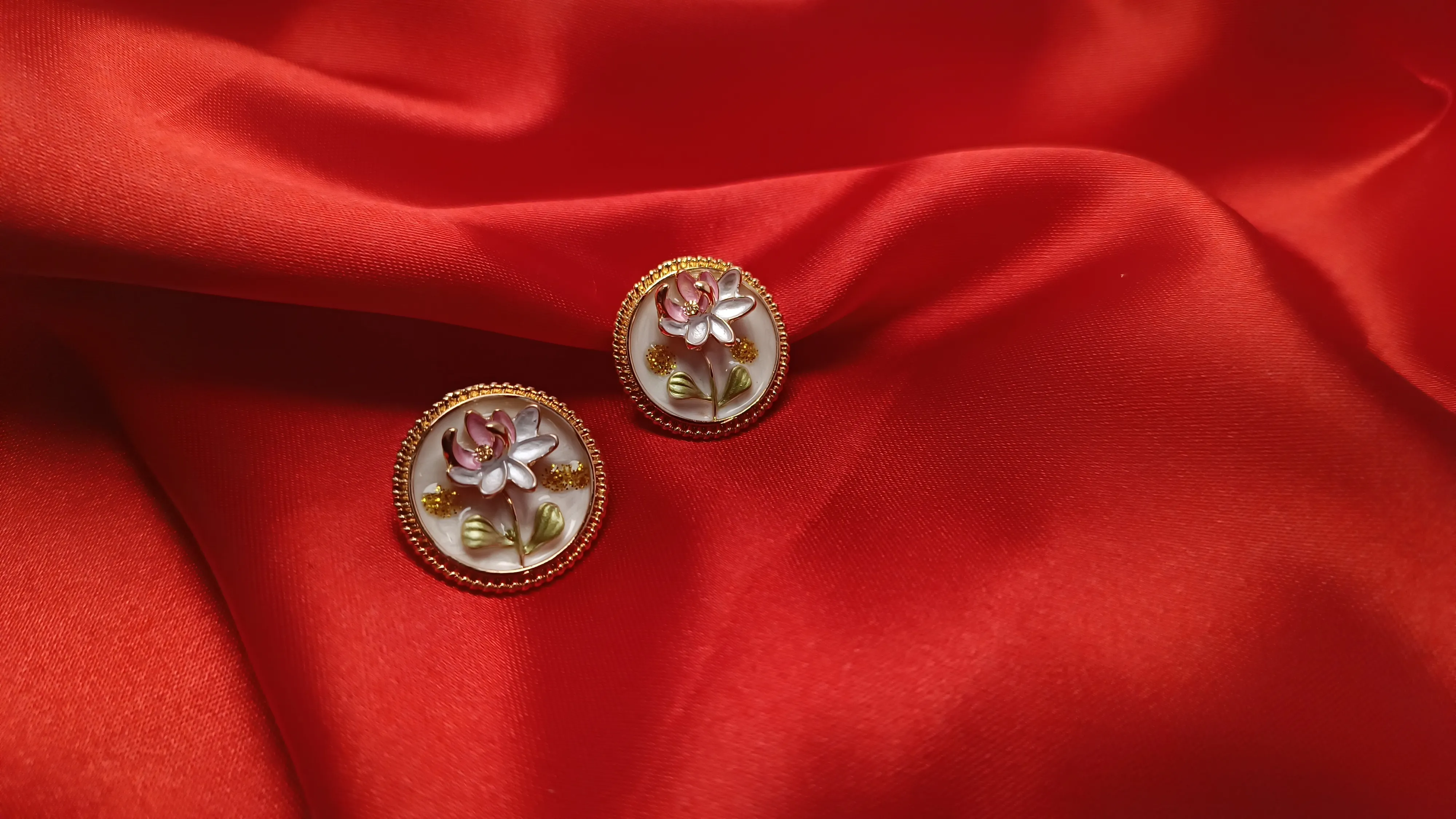 Immerse yourself in the lush elegance of our Emerald Garden Medallion Studs. A striking variation of our vintage-inspired collection, these circular earrings feature a rich, deep emerald White enamel base that provides a dramatic backdrop for the hand-painted floral artistry. At the heart of each medallion is a delicate lotus blossom, rendered in soft pearlescent white and tipped with gentle rose pink. Intricate sage green stems and shimmering gold-leaf accents add layers of depth, all encased beneath a crystal-clear, high-gloss resin dome. Finished with a signature gold-toned beaded frame, these studs capture the essence of a hidden garden in a timeless, wearable piece of art.
