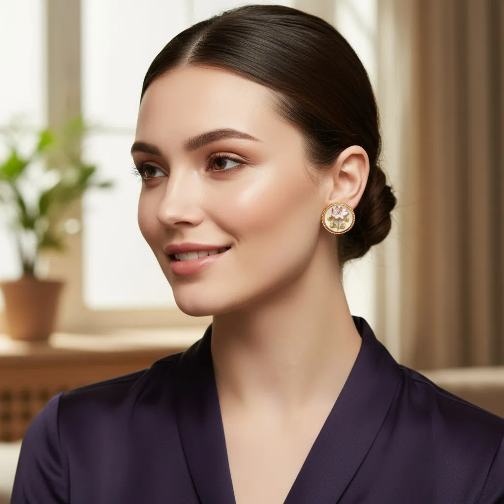 Hand-Painted Cold Enamel & Transparent Resin Overlay , Soft Rose, Pearl White, white, and Champagne Gold, Circular Medallion / Cameo Style with Beaded Frame, Balanced for All-Day Wear (Lightweight), Hypoallergenic Post with Butterfly Back