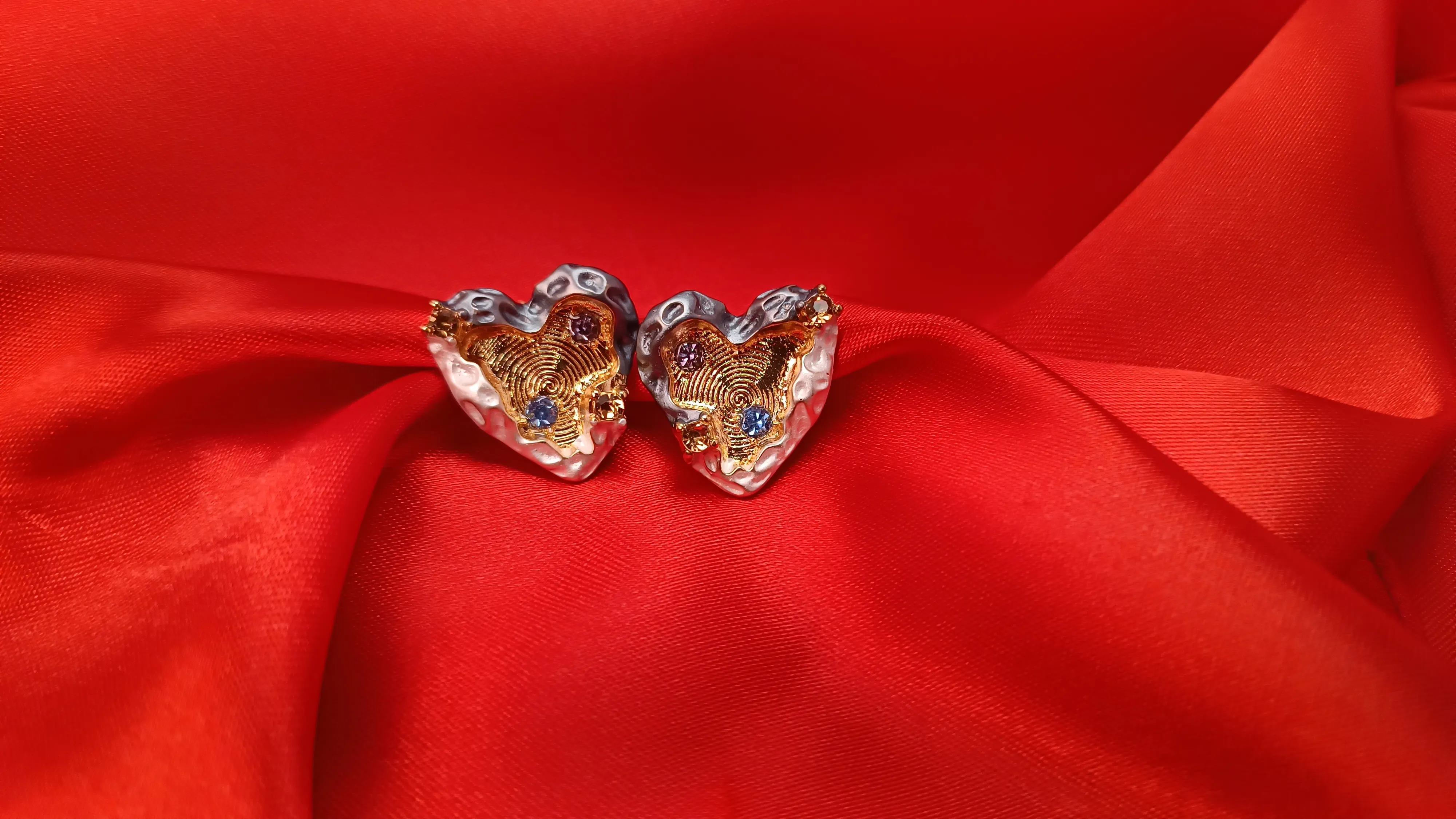Designed to be a conversation starter, each heart is meticulously hand-set with faceted crystals in deep sapphire and amethyst tones, providing a touch of regal brilliance. These studs offer a perfect blend of modern architectural design and whimsical charm, making them the ultimate accessory for those who love jewelry with a unique, handcrafted feel.
