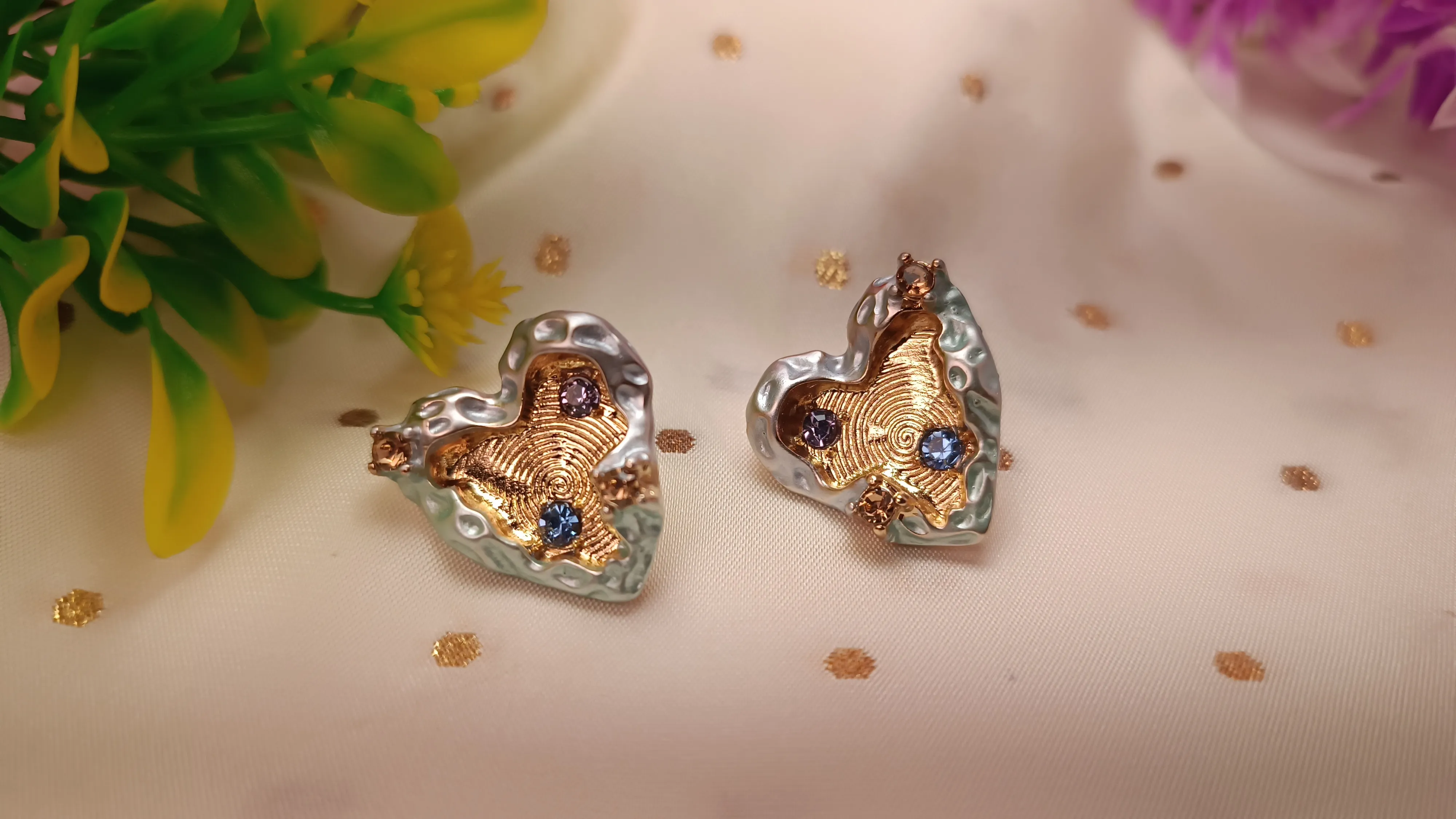 Dual-Tone Aurora Heart Earrings – Crystal Embellished Textured Statement Studs