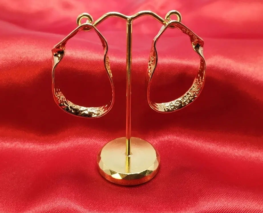 The unique, asymmetrical shape and textured surface catch the light from every angle, creating a sophisticated and high-fashion aesthetic. Crafted with a high-polish gold finish, these open hoops are lightweight enough for all-day wear while remaining bold enough to be the centerpiece of your evening look. Perfect for the modern woman who values avant-garde style and effortless elegance.