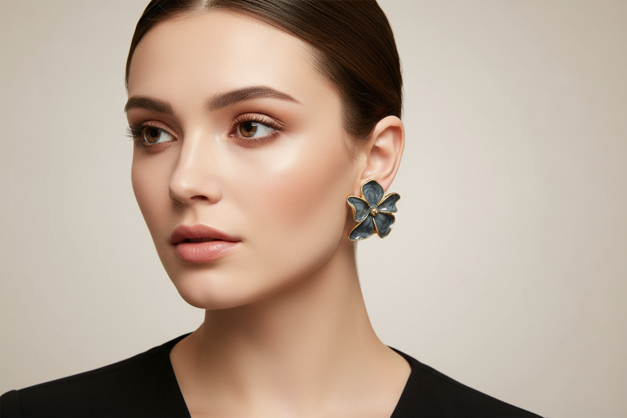Product Type: Stud Earrings Design: Korean Floral Stone Type: Premium Gloss Resin Color: Smoky Black / Charcoal with Gold Accents Finish: High-Gloss with Gold-Tone Border Base Material: High-Quality Alloy Closure Type: Push Back (Stud) Style: Elegant • Minimal • Luxury Occasion: Party Wear, Evening Wear, Festive, Gifting Comfort: Lightweight & Skin-Safe Ideal For: Women & Girls