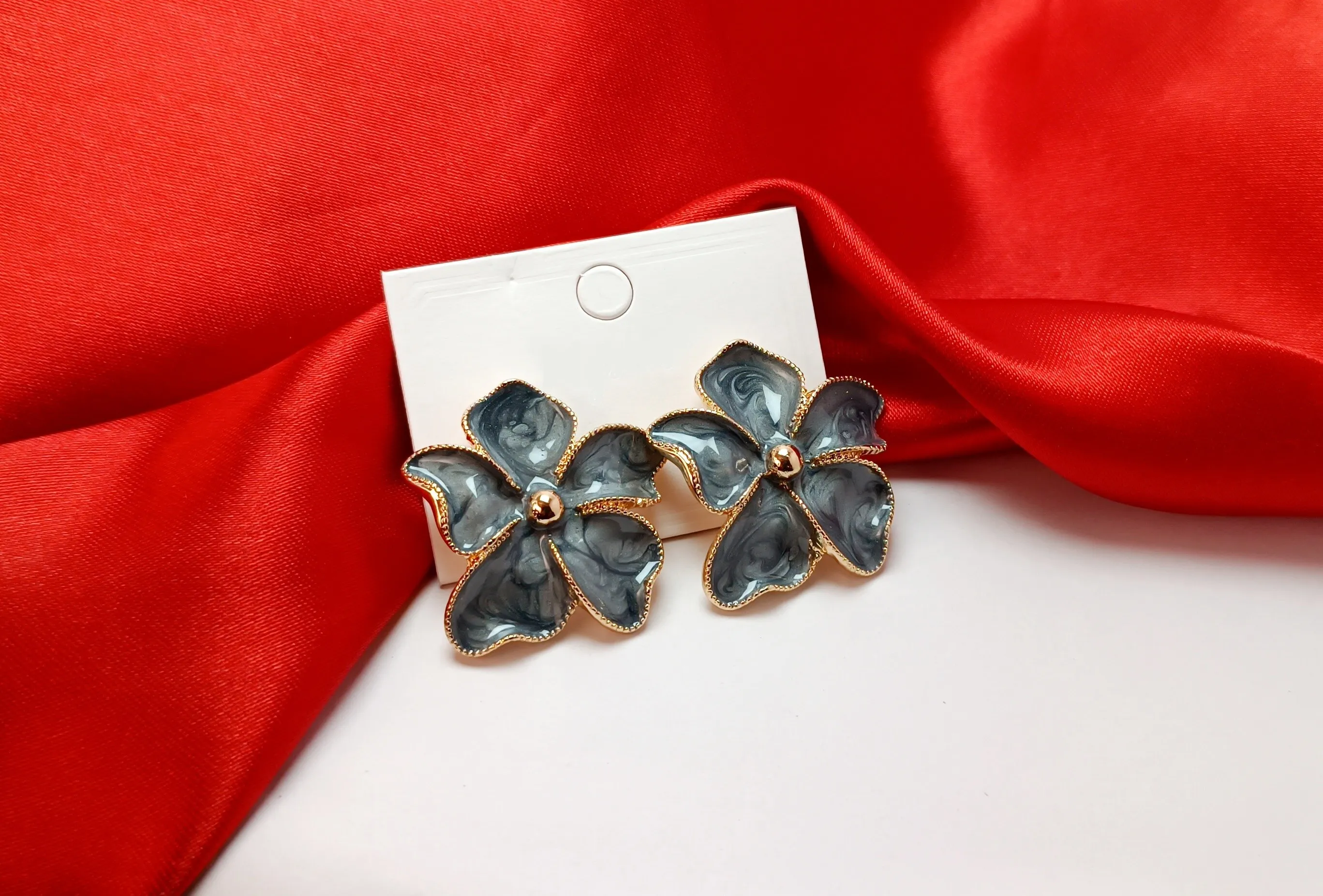 Elegant and mysterious, the Midnight Bloom Korean Floral Stud Earrings are designed for women who love subtle luxury. Featuring translucent charcoal-black floral petals with soft marble detailing, these earrings are finished with a delicate gold-tone outline and a polished golden center.