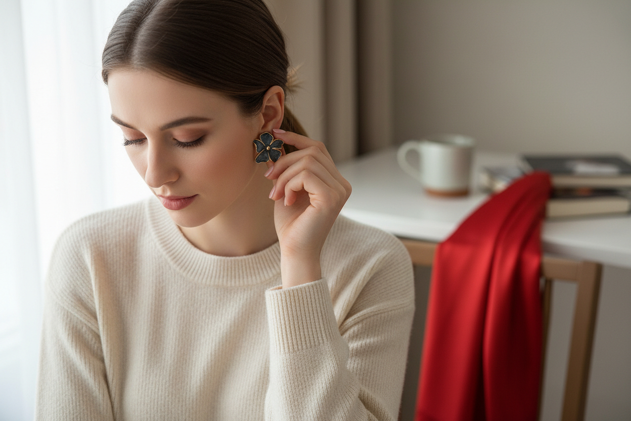 Elegant and mysterious, the Midnight Bloom Korean Floral Stud Earrings are designed for women who love subtle luxury. Featuring translucent charcoal-black floral petals with soft marble detailing, these earrings are finished with a delicate gold-tone outline and a polished golden center. The deep smoky shade paired with warm gold accents creates a refined contrast, making these studs perfect for evening wear, festive outfits, and modern ethnic looks. Inspired by flowers blooming under moonlight, the Midnight Bloom earrings offer a graceful blend of minimalism and glamour. The glossy resin petals catch light beautifully, while the intricate gold edging adds a couture finish. Lightweight and skin-friendly, they ensure comfort without compromising on style.