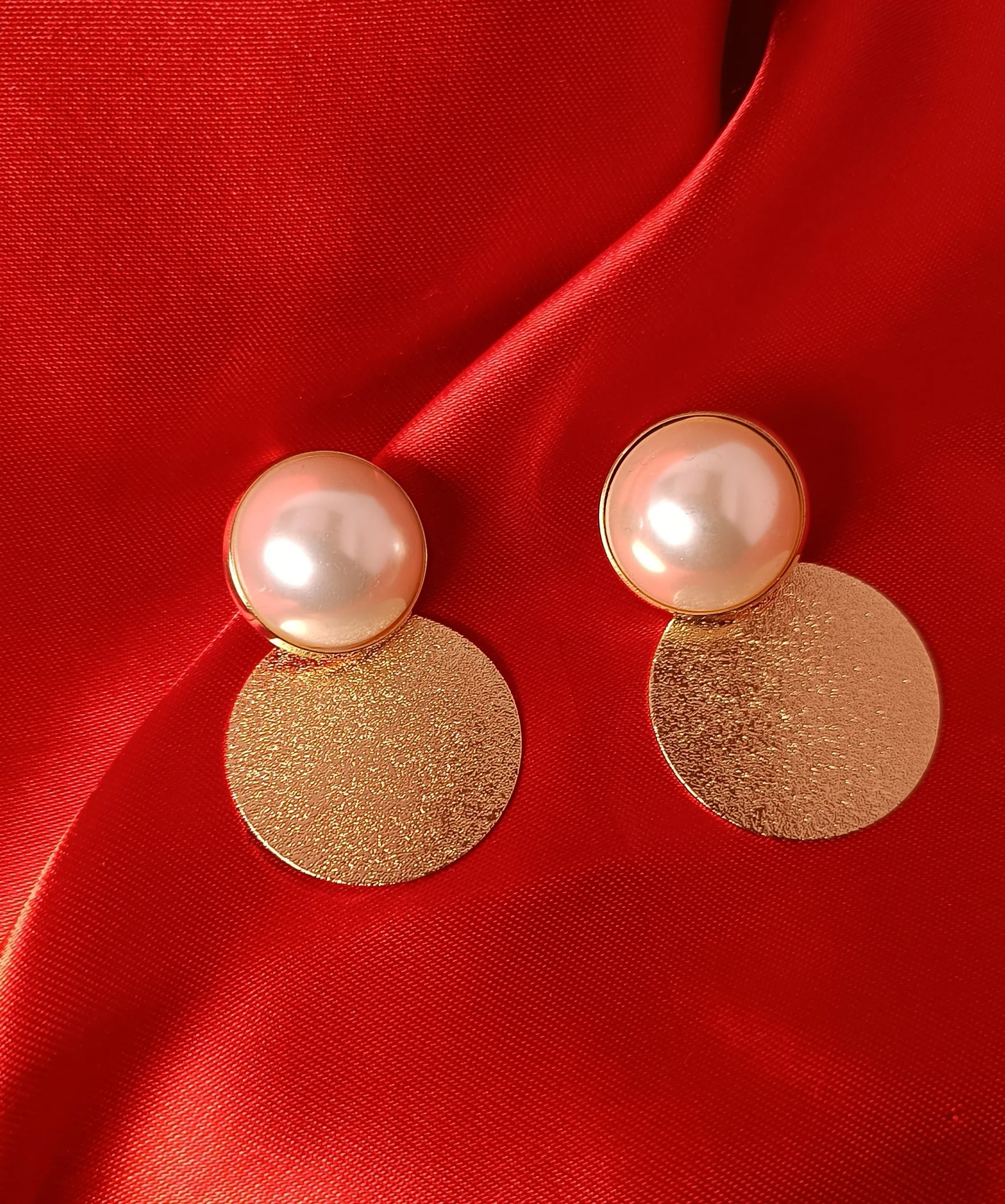 Step into the spotlight with the Golden Luna Pearl Studs, a masterclass in contrasting textures and timeless elegance. These earrings feature a dual-element design: a smooth, oversized cream pearl nestled in a gold-tone setting, paired with a suspended, crescent-inspired circular disc. The disc boasts a unique sandblasted, "stardust" texture that catches the light with a subtle, sophisticated shimmer, beautifully offsetting the soft, iridescent glow of the pearl.
