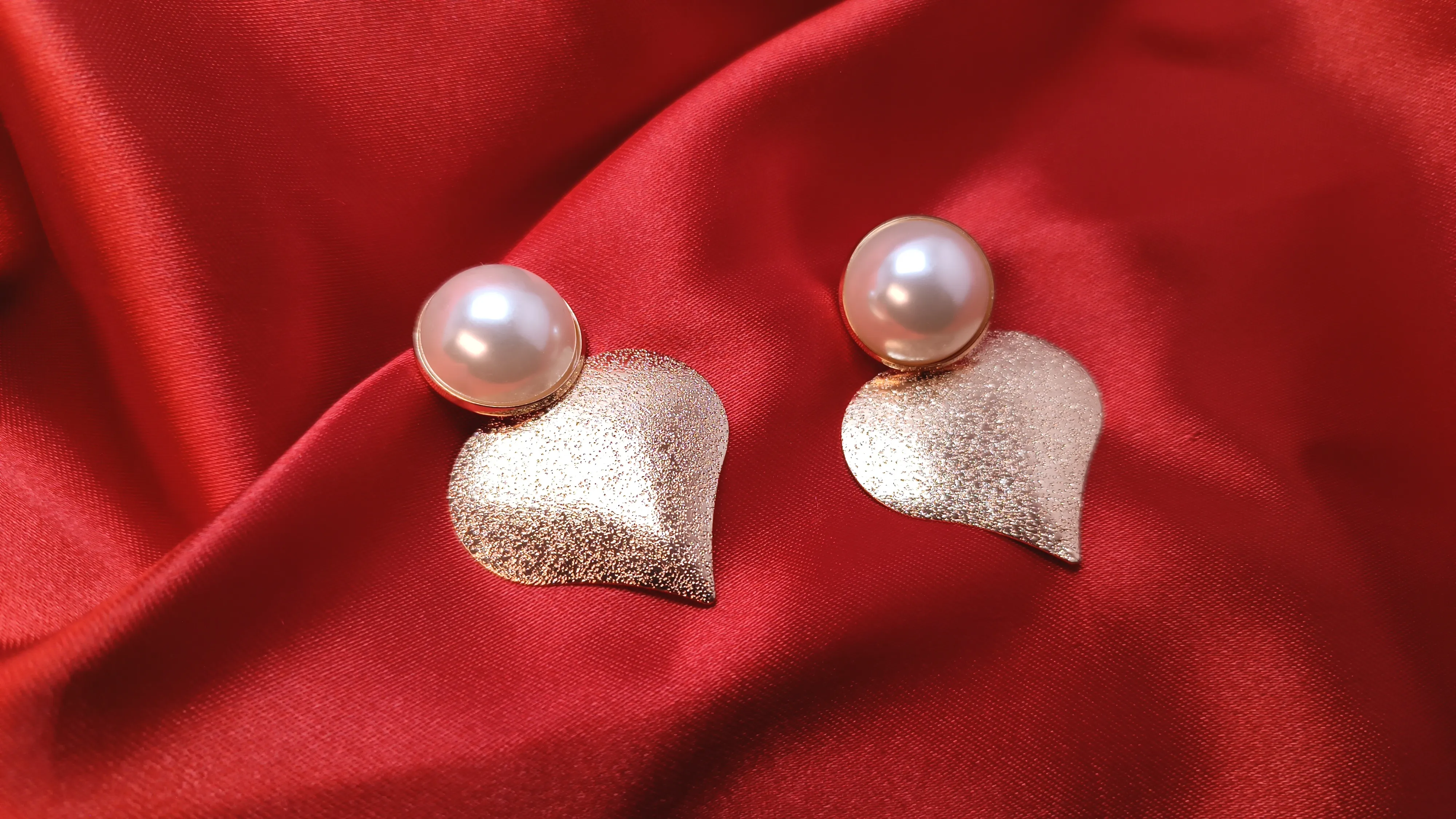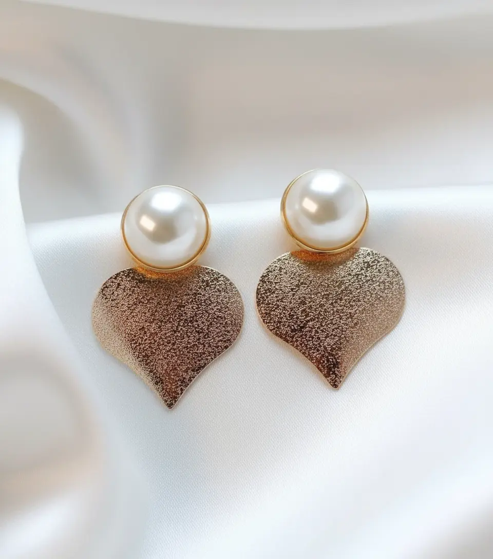 Capture hearts with the Radiant Heart Pearl Drops, a perfect blend of romantic charm and modern sophistication. These eye-catching earrings feature a high-luster, creamy white pearl stud that sits elegantly on the ear. Draping gracefully below is a beautifully contoured heart-shaped pendant, finished with a unique sandblasted gold texture that glimmers with every turn of the head.
