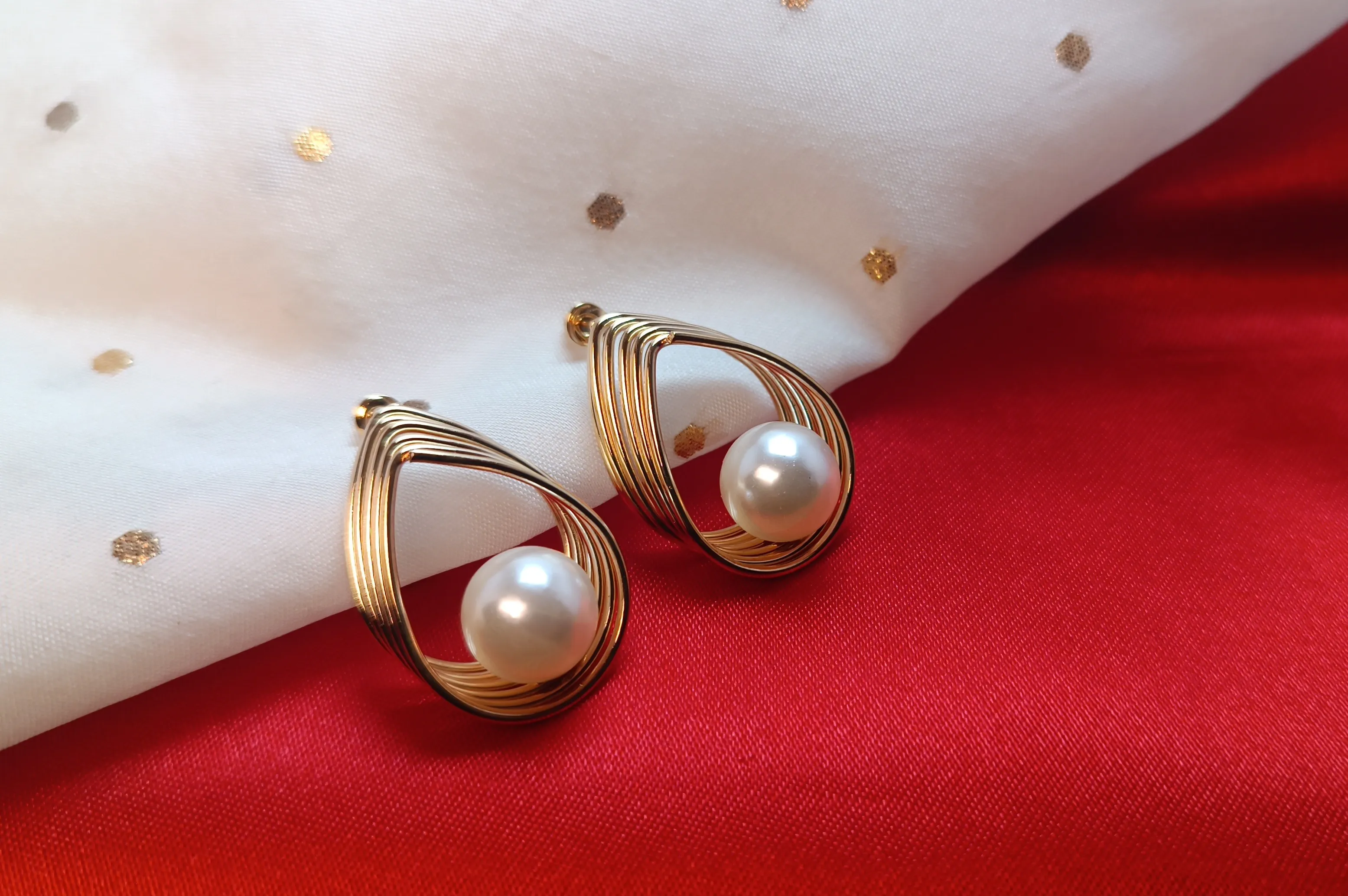 Gold Plated Spiral Teardrop & Pearl Earrings – Elegant Architectural Studs