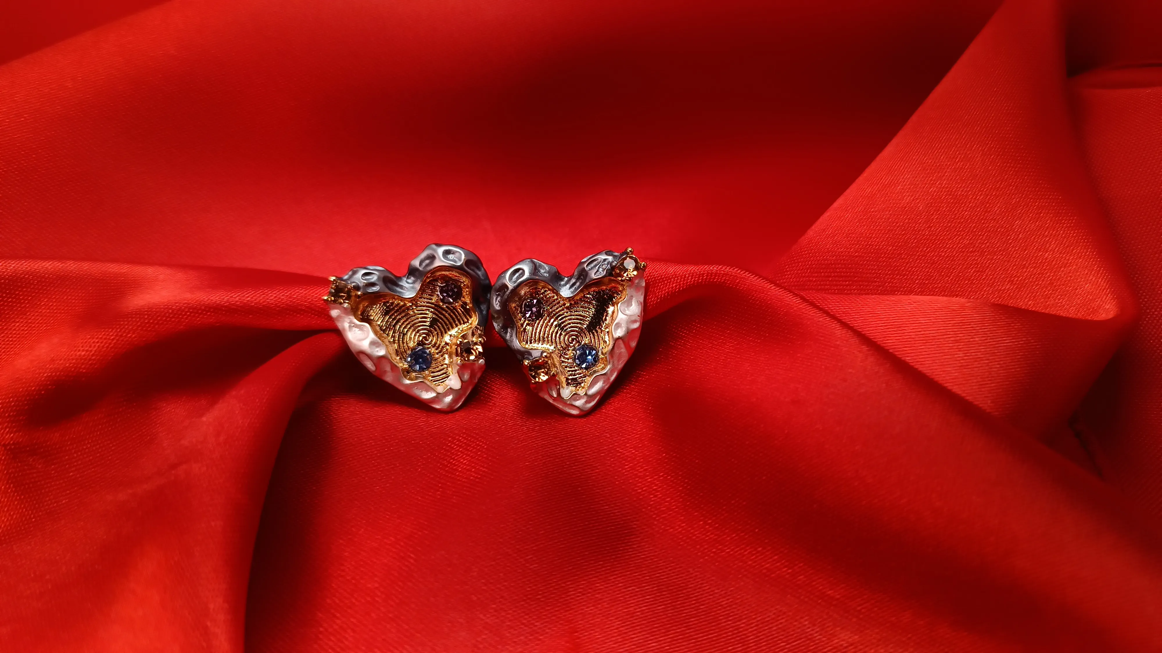 Designed to be a conversation starter, each heart is meticulously hand-set with faceted crystals in deep sapphire and amethyst tones, providing a touch of regal brilliance. These studs offer a perfect blend of modern architectural design and whimsical charm, making them the ultimate accessory for those who love jewelry with a unique, handcrafted feel.